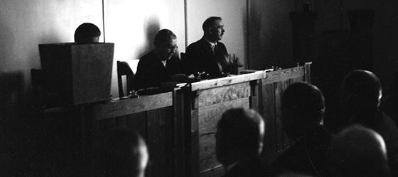 ​Vuoden 1940 valtiopäivien ensimmäinen täysistunto 1.2.1940. Istunnossa toimitettiin puhemiesten vaali. Puhetta johtaa ikäpuhemies Miina Sillanpää, pöydän takana myös eduskunnan sihteeri E.H.I. Tammio ja notaari Aku Kostia. Kuva: Vilho Heinämies / Eduskunta