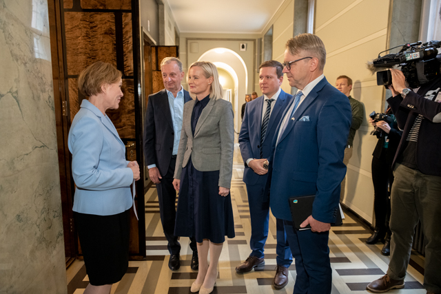 Edustajat Riikka Purra (ps.), Ville Tavio (ps.) (oikealla) Peter Östman (kd.) ja Harry Harkimo (liik.) (takana oikealla) jättivät välikysymyksen eduskunnan lainsäädäntöneuvos Tuula Kulovedelle.
