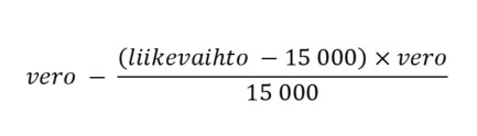 Verovelvollinen, jonka tilikauden liikevaihto (kaavassa liikevaihto) ylittää 15 000 euroa, saa tilikaudelta tilitettävästä verosta (kaavassa vero) huojennuksen, jonka suuruus määräytyy seuraavasti: