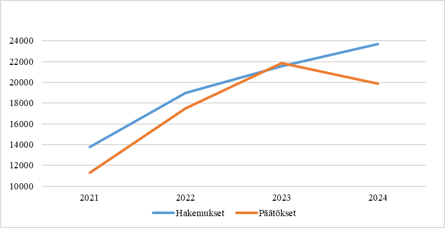Perheenyhdistämisdirektiivin kansalliseen täytäntöönpanoon liittyvien lakimuutosten voimaantulon jälkeen Suomen kohdistuva maahanmuutto on voimakkaasti lisääntynyt ja maahanmuuttopolitiikan toimintaympäristö on muuttunut oleellisesti. Erityisesti vuoden 2021 alusta alkaen perhesideperusteisten hakemusten määrä on ollut kasvussa (Ks. tarkemmin tilastoja luku 2.1.4.). Kun hakemusmääriä tarkastellaan pidemmällä aikavälillä ja verrataan lähes kymmenen vuoden takaisiin hakemusmääriä koskeviin tilastoihin, huomataan, että muutos hakemusmäärissä on ollut merkittävä. Esimerkiksi vuonna 2015 perhesideperusteisia hakemuksia jätettiin yhteensä 9 469 ja vuoden 2024 aikana hakemuksia jätettiin yhteensä 23 701. Oleskelulupahakemusten määrä on siis vajaassa kymmenessä vuodessa yli kaksinkertaistunut. Perheenjäsenten hakemusmäärän kehitys on riippuvainen muusta Suomeen suuntautuvasta muuttoliikkeestä. Viimeisen neljän vuoden hakemusmäärän kasvu on pääosin ollut riippuvaista Suomeen suuntautuvan työ- ja opiskeluperusteisen maahanmuuton lisääntymisestä.