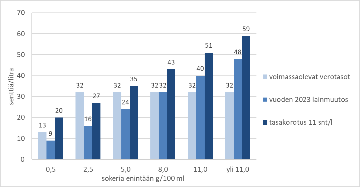 Lisäksi ehdotetaan, että kaikkien virvoitusjuomien valmisteveroa korotettaisiin. Korotus toteutettaisiin senttimääräisesti samansuuruisena korotuksena kaikille tuoteryhmille. Hallitusohjelman, kehysriihen ja puoliväliriihen mukaisen tuottotavoitteen täyttävä veronkorotus olisi 11 senttiä litralta vuonna 2023 vahvistettuihin verotasoihin. Korotuksen jälkeen sokerittomien juomien ja pakkaamattomien juomien vero olisi 20 senttiä litralta. Sokeria sisältävien juomien veron määrä olisi 27, 35, 43, 51 tai 59 senttiä litralta. Sokerittomien juomien verotaso nousisi seitsemän senttiä litralta ja sokeripitoisten keskimäärin 15 senttiä litralta voimassa oleviin verotasoihin nähden. Alla olevassa kuvassa on havainnollistettu sekä vuoden 2023 lainmuutoksen että ehdotetun tasakorotuksen vaikutuksia voimassa oleviin verotasoihin nähden eri sokeripitoisuuden juomilla.