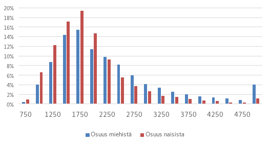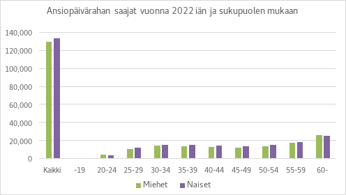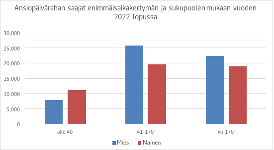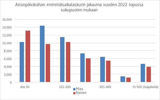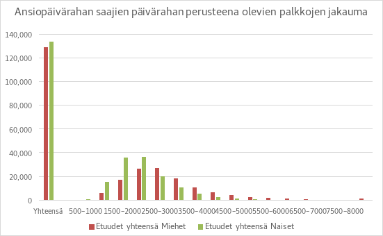 Vuonna 2022 ansiopäivärahan saajista 49 prosenttia oli miehiä ja 51 prosenttia naisia. Kuviossa 1 on esitetty ansiopäivärahan perusteena olevien palkkojen jakauma vuonna 2022. Kuviosta näkee, että päivärahojen perusteena olevan palkat ja sitä myötä ansiopäivärahan taso on naisilla selvästi matalampi kuin miehillä. Tämän taustalla on työmarkkinoiden sukupuolittunut rakenne: naisten palkat ovat keskimäärin pienempiä kuin miehillä. Tämän lisäksi naiset tekevät myös miehiä enemmän osa-aikatyötä. Näiden syiden vuoksi naisten vakuutuspalkat ovat matalampia kuin miesten.