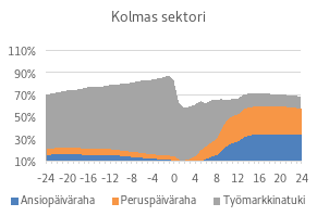 2) 1 kohdassa tarkoitetun maksukauden jälkeen, ansiopäivärahan ansio-osaa tai korotettua ansio-osaa vähennetään niin, että 1 §:n 3 momentissa tarkoitettu ansiopäiväraha on 80 prosenttia täydestä ansiopäivärahasta kunnes ansiopäivärahaa on maksettu yhteensä 170 työttömyyspäivältä; ja