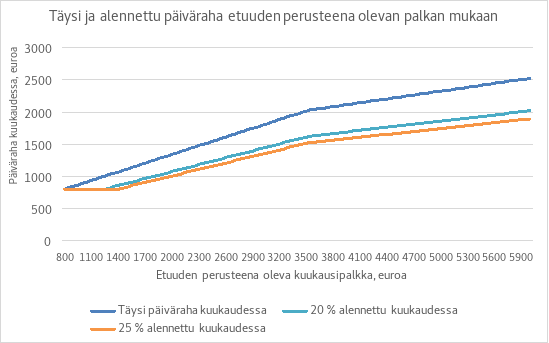 Ansiopäivärahan alentaminen tehtäisiin alentamalla ansio-osaa tai korotettua ansio-osaa niin paljon, että perus- ja ansio-osasta muodostuva ansiopäiväraha alentuisi kokonaisuudessaan edellä todetun verran. Ansiopäiväraha ei kuitenkaan voisi olla pienempi kuin peruspäiväraha tai peruspäiväraha korotettuna työllistymistä edistävien palveluiden ajalta maksettavalla korotusosalla.