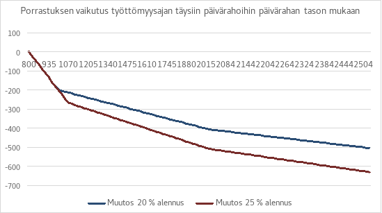 Ehdotuksen mukaan ansiopäivärahan määrää porrastettaisiin niin, että ansiopäiväraha alenisi työttömyyden pitkittyessä. Ansiopäivärahaa alennettaisiin ensimmäisen kerran, kun työttömyyspäivärahaa on maksettu 40 työttömyyspäivältä ja toisen kerran, kun sitä on maksettu 170 työttömyyspäivältä. Ensimmäisen portaan kohdalla ansiopäiväraha alenisi 20 prosenttia ja toisen kohdalla 25 prosenttia suhteessa siihen ansiopäivärahaan, joka perustuu työssäoloehdon ajalta kertyneeseen ansiopäivärahan perusteena olevaan palkkaan. Ansiopäivärahan leikkaus ei siis kertautuisi.