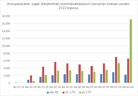 Ansiopäivärahaa maksettiin vuonna 2022 yhteensä reilulle 260 000 henkilölle yhteensä noin 1,81 miljardia euroa. Keskimääräinen ansiopäiväraha vuonna 2022 oli 65,76 euroa päivässä eli hieman yli 1 400 euroa kuukaudessa. Keskiarvoa alentavat sovitellut päivärahat. Lapsikorotukset ja aktiiviajalta maksetut korotusosat nostavat keskiarvoa. Täytenä maksettujen päivärahojen keskiarvo oli noin 77 euroa päivässä eli noin 1 650 euroa kuukaudessa.