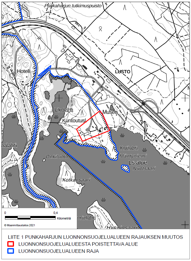 Erotettavaksi esitetty entisen Finlandia-hotellin alue sijoittuu luonnonsuojelualueen reunaan ja rajoittuu Luston asemanseudun ja Metsätietokeskus Luston rakennettuun ympäristöön. Lisäksi se on kaukana Punkaharjun harjualeen keskiöstä ja näköalapaikoilta eikä sen erottamisella ja kehittämisellä matkailutarkoituksiin ole siten vaikutusta kansallismaiseman suojeluun tai hoitoon. Finlandia-hotellin alueen luonnonolosuhteita on tarkasteltu vuoden 2011 asemakaavaluonnoksessa. Alue on pääosin harjujen metsäistä luontotyyppiä, joka on vallitseva Punkaharjun luonnonsuojelualueen maa-alueilla. Kaavaluonnosalueelta on laadittu Natura-arviointi, jossa on arvioitu asemakaavan vaikutuksia Natura-alueen luontoarvoihin. Alueen käyttötarkoituksen muutoksella ei siten olisi todennäköisesti merkittävästi heikentäviä vaikutuksia Natura-alueen suojelun perusteena oleviin luontoarvoihin.