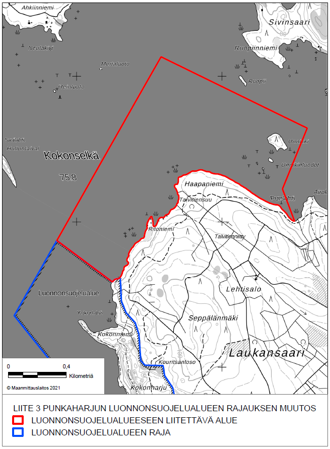Ehdotettavalla rajausmuutoksella luonnonsuojelualueesta erotettaisiin noin 3,2 hehtaarin laajuinen entisen Finlandia-hotellin rakennusryhmän alue sekä 0,048 hehtaarin laajuinen Kruunupuiston henkilökunnan pysäköintialue. Vastaavasti siihen liitettäisiin luonnonsuojelualueen pohjoispuolella, Puruvedellä sijaitseva 114 hehtaarin vesialue ja sen sisällä oleva 1 hehtaarin laajuinen Unnikkisaari sekä 0,11 hehtaarin laajuinen harjumetsän alue Kruunupuiston pysäköintialueen koillispuolelta. Erotettavien ja liitettävien alueiden rajat on merkitty lakiesityksen liitteenä oleviin karttoihin.