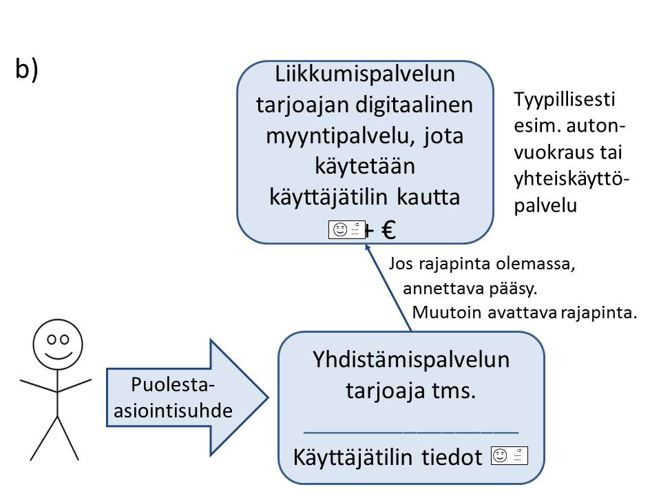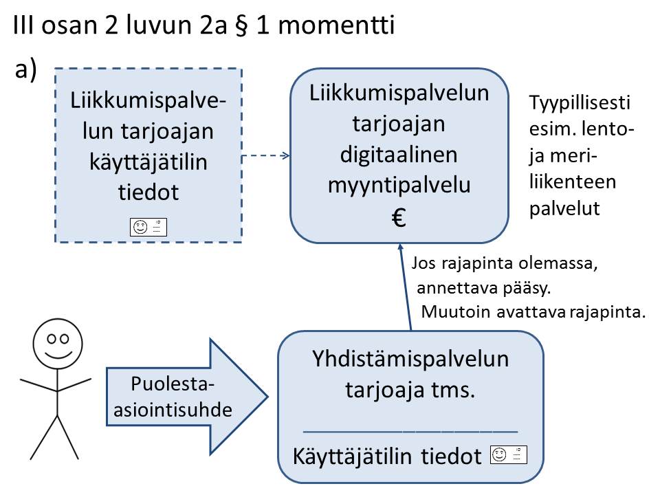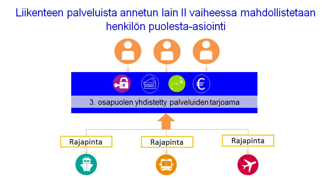 Liikenteen palveluista annetun lain tavoitteiden toteuttamista varten tarvitaan tietojen avaamista ja avointen rajapintojen kautta tapahtuvaa asiointia. Tietojen avaamista jatkettaisiin liikkumispalveluiden käyttöä koskevan tiedon osalta niin, että Liikennevirastolle asetettaisiin velvoite avata saamansa palveluiden käyttöä kuvaavat tiedot sekä tekemänsä tilastot ja tutkimukset avoimen rajapinnan kautta sellaisessa muodossa, että niitä ei pystytä yhdistämään yksittäisiin käyttäjiin, palveluntarjoajiin tai palveluihin. Yhtenäisten matkaketjujen ja yhdistettyjen palveluiden tarjoamismahdollisuuksia puolestaan helpotettaisiin edelleen mahdollisuudella kytkeä palvelukokonaisuuteen tie- ja raideliikenteen lisäksi lento- ja meriliikenteen matkalippuja, erilaisia liikkumispalveluita, kuten ajoneuvojen vuokrauspalveluita, erilaisia sarja- tai kausituotteita sekä alennuksia. Tämä toteutettaisiin niin, että henkilö voisi sallia sen, että kolmas osapuoli asioisi hänen puolestaan hänen käyttäjätileillään eri palveluissa.