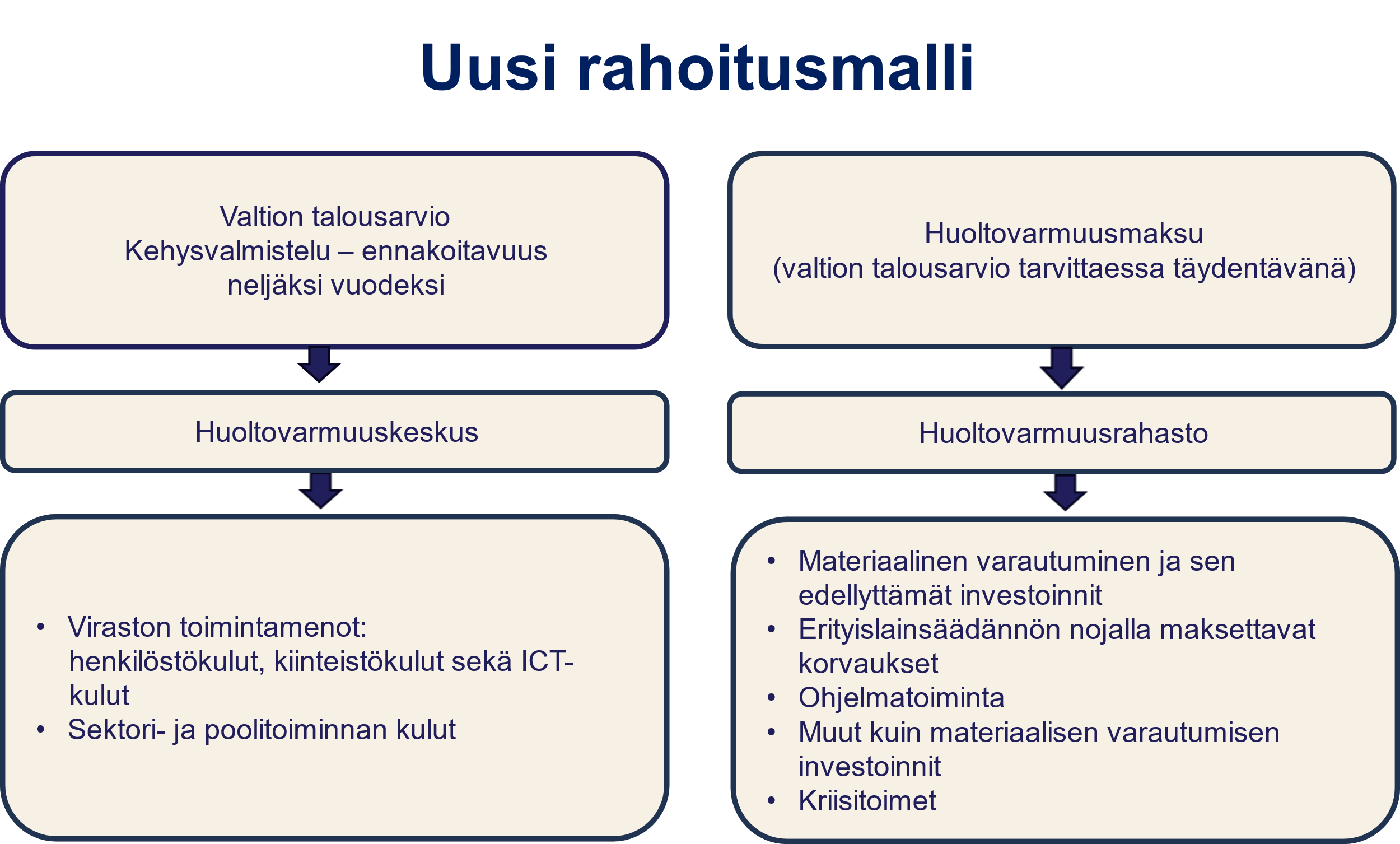 Huoltovarmuusrahaston hallintaan ja siten rahaston taseeseen merkittäisiin kaikki materiaaliseen varautumiseen liittyvät kiinteistöt, maa-alueet, rakennukset ja rakennelmat sekä muu Huoltovarmuuskeskuksen 31.3.2026 laadittavassa välitilinpäätöksissä oleva omaisuus. Huoltovarmuusrahastosta rahoitetaan materiaalisen varautumisen toimenpiteitä, joihin edellä mainittu keskeisen omaisuuden hallinta liittyy.