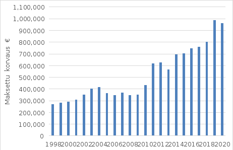 Kuva 3. Maksettujen korvausten määrä (€/vuosi) maakotkan porotaloudelle aiheuttamista vahingoista vuosina 1998-2020.