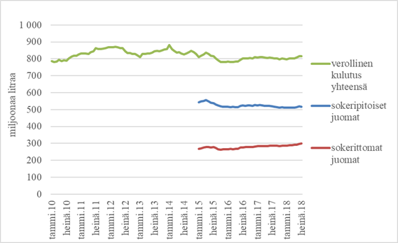 Virvoitusjuomia verotettiin vuonna 2017 noin 800 miljoonaa litraa. Tästä runsas kolmasosa oli sokerittomia juomia ja vajaa kaksi kolmasosaa sokeripitoisia juomia. Verollisten juomien kulutus väheni edellisvuodesta noin prosentin. Virvoitusjuomien verollinen kulutus on ollut suhteellisen vakaata viime vuosina. Sokeripitoisten juomien kulutus näyttää kuitenkin hieman laskeneen ja sokerittomien juomien kasvaneen. Juomatiivisteiden osuus verollisesta kulutuksesta on vajaa viidennes.