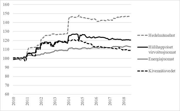 Kuva 2. Kivennäisvesien ja eräiden muiden virvoitusjuomien hintakehitys vuodesta 2010 alkaen, vuosi 2010=100