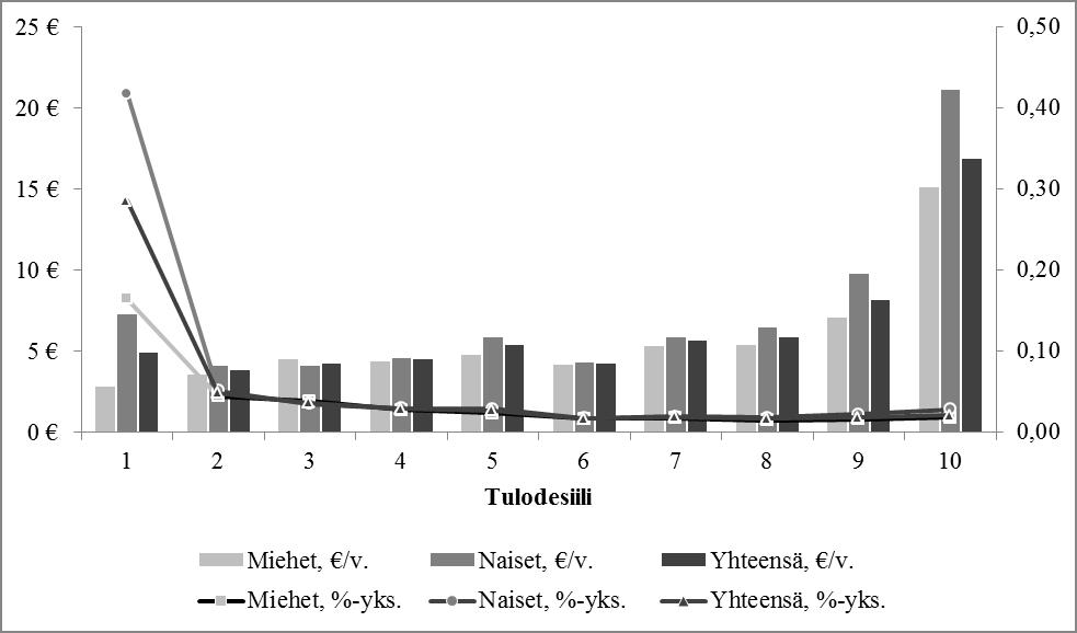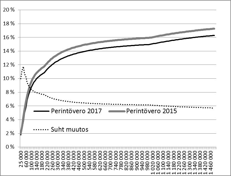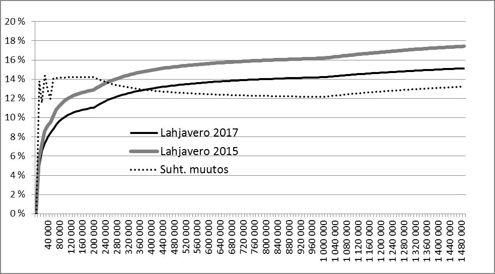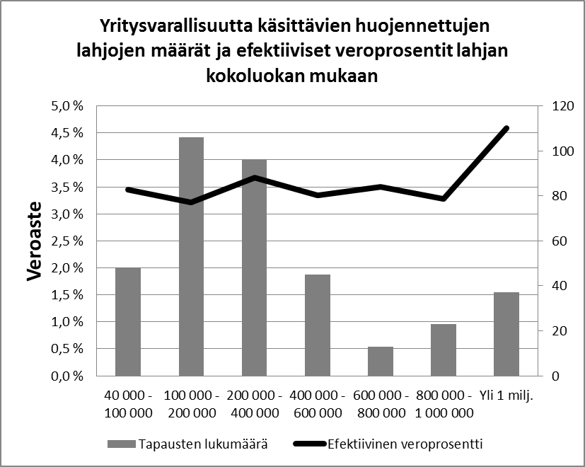 Alla olevasta kuviosta ilmenee edellä mainittuja 400 muuta yritystä kuin maatilaa koskevien huojennuspäätösten lukumäärä (oikea pystyakseli) ja efektiivinen veroaste (vasen pystyakseli) luokiteltuna lahjan arvon mukaan. Lahjan arvo on luovutetun yritysvarallisuuden arvo vähennettynä esimerkiksi hallintaoikeusvähennyksellä.