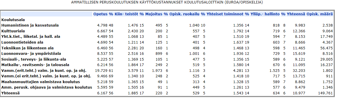 Luku- ja kirjoitustaidon opetus | 835 Työ- ja elinkeinoministeriön ilmoittama opiskelijoiden lukumäärä | 7 533,00 Työ- ja elinkeinoministeriön ilmoittama vuoden 2015 opiskelijatyöpäivän hinta 41,85 euroa kerrottuna 180 päivällä. Työ- ja elinkeinoministeriö on ilmoittanut koulutuksen keskimääräiseksi kestoksi 160-200 päivää | 6 290 000 Työ- ja elinkeinoministeriön mukaan vuoden 2015 toteutunutta kokonaiseuromäärää ei ole tiedossa johtuen siitä, että hankinnat eivät ole kohdistuneet kustannusseurannassa tapahtuneen koodimuutoksen takia oikein | 22 545 |