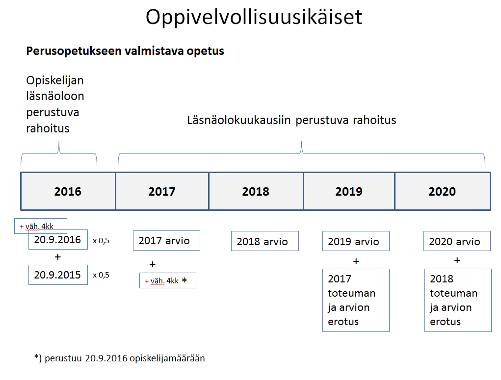 Perusopetukseen valmistavan opetuksen oppilaskohtainen rahoitus laskee vuodesta 2017 hallituksen vuosien 2017—2020 julkisen talouden suunnitelmassa esitetyn mukaisesti. Julkisen talouden suunnitelman mukaan oppilasmäärien ja opetusryhmien kasvaessa turvapaikanhakijamäärien kasvun vuoksi perusopetukseen valmistavan opetuksen oppilaasta maksettavan rahoituksen määräävää kerrointa voidaan alentaa 1,67:ään, mikä vastaa perusopetuksen keskimääräistä hintaa kahdentoista oppilaan ryhmässä. Uusi kerroin muodostuisi jakamalla kerroin 1,67 yhdeksällä, jolloin yhden läsnäolokuukauden kerroin olisi pyöristettynä 0,186.