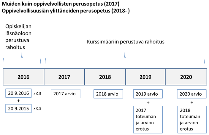 Muiden kuin oppivelvollisten rahoituksen määräytymisen perusteena olisi jatkossa suoritetut kurssit. Koska ei ole olemassa tilastotietoja kurssimääristä, rahoituksen laskenta perustuisi vuosina 2017 ja 2018 pykälän 1 momentin mukaan kurssimääräarvioon, joka suhteutettaisiin aiempien vuosien oppilasmäärään. Kurssimääräarvioon perustuva rahoitus tarkistettaisiin toteutuneen suoritettujen kurssien määrän mukaiseksi varainhoitovuotta seuraavaa vuotta seuraavana vuonna ottamalla huomioon toteutuneen ja arvioidun kurssimäärän erotus. Momentti ei koskisi perusopetuslain 46 §:n 2 momentissa tarkoitettua perusopetuksen aineopetusta.