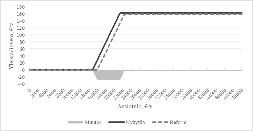 Yleisradioveroon ehdotettu muutos tarkoittaisi sitä, että yleisradioveron maksukynnys nousisi palkkatulon osalta 15 900 euroon nykyisestä 14 750 eurosta. Eläketulon ja päivärahatulon osalta maksukynnys nousisi nykyisestä noin 14 000 eurosta 15 150 euroon. Ehdotuksen seurauksena yleisradioveroa maksavien määrä vähenisi noin 90 000 henkilöllä. Tämä ei kuitenkaan merkitsisi laajaksi tarkoitetun yleisradioveropohjan merkittävää kaventumista. Muutos kasvattaisi näiden henkilöiden käytettävissä olevia tuloja keskimäärin noin 14,5 eurolla vuodessa.