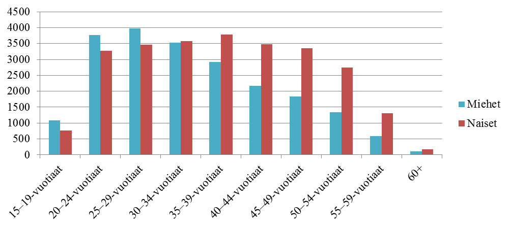 Vuonna 2016 oppisopimuskoulutuksessa oli yhteensä noin 47 000 henkeä. Oppisopimusopiskelijoiden ikäjakauma eroaa selvästi miesten ja naisten kesken (kuvio 3). Miehet käyvät oppisopimuskoulutuksen tyypillisesti selvästi nuorempina kuin naiset. Miehillä suurin ikäryhmä oppisopimuskoulutuksessa on 25–29-vuotiaat, kun taas naisilla 35–39-vuotiaat. Naisilla oppisopimuksen suorittaminen ei itse asiassa painotu lainkaan työuran alkupäähän, vaan oppisopimuskoulutuksen käyminen jakautuu hyvin tasaisesti eri ikäryhmien kesken. Naisten keskuudessa merkittävä osa, noin 16 prosenttia oppisopimuskoulutuksen käyvistä, suorittaa koulutuksen jopa yli 50-vuotiaana. Miesten keskuudessa vastaava osuus on 10 prosenttia.