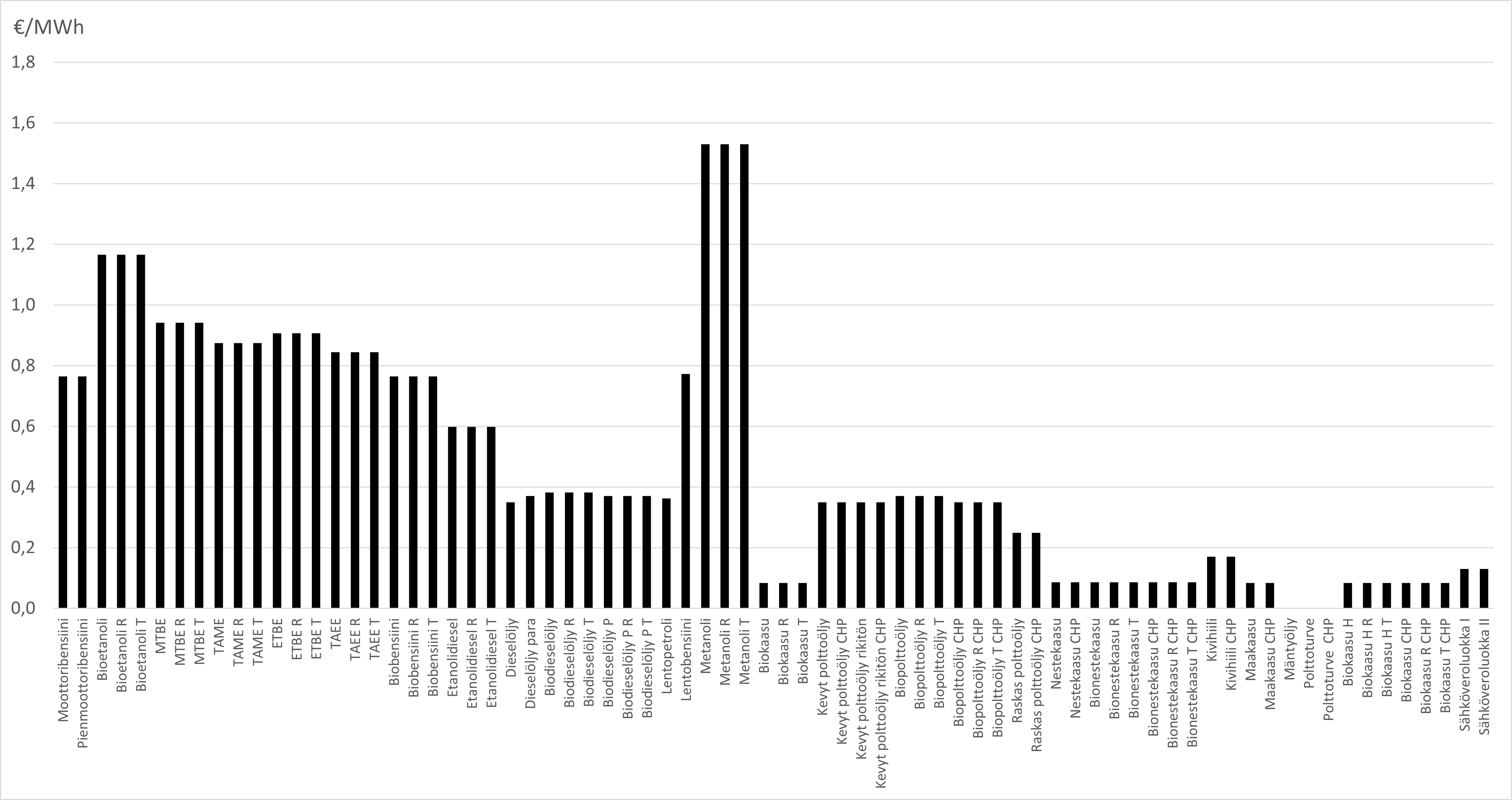 Maksun suuruus ei ole looginen myöskään esimerkiksi suhteutettuna eri energiatuotteiden energiasisältöön. Kuten kuviosta 1 nähdään, liikenteen polttoaineiden huoltovarmuusmaksu on korkein fossiilista moottoribensiiniä ja dieseliä korvaavilla, usein bioperäisillä polttoaineilla. Liikenteessä käytetyn maakaasun ja sähkön huoltovarmuusmaksut ovat matalia. Lämmityspolttoaineista huoltovarmuusmaksu on korkein öljytuotteilla ja matalin nestekaasulla, maakaasulla ja biokaasulla sekä turpeella, josta ei kanneta huoltovarmuusmaksua. Sähkön huoltovarmuusmaksu on energiayksikköä kohti matala myös moniin lämmityspolttoaineisiin kuten polttoöljyihin verrattuna.
