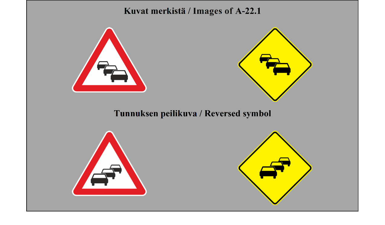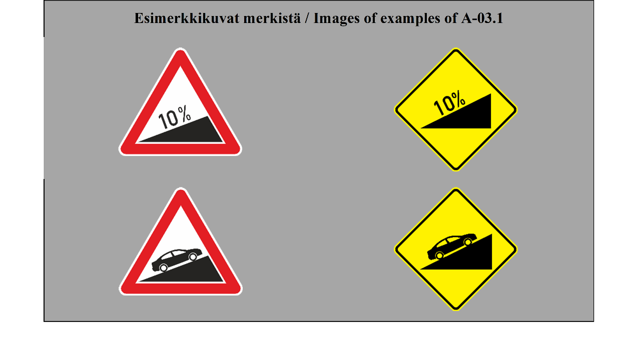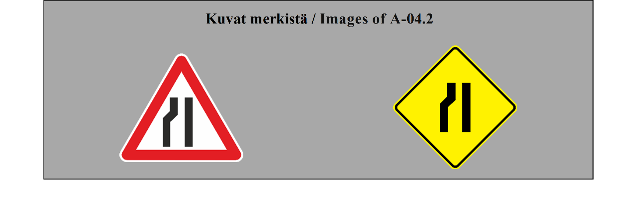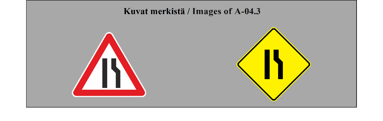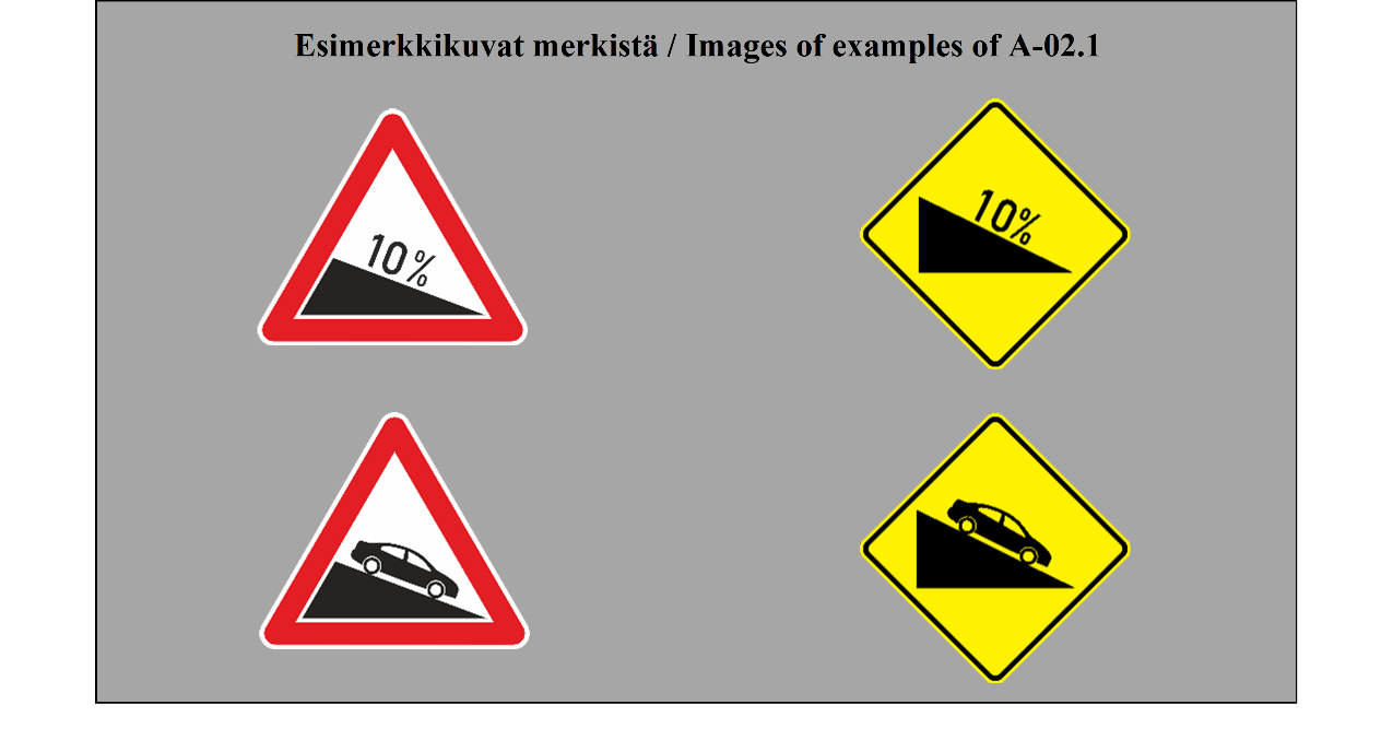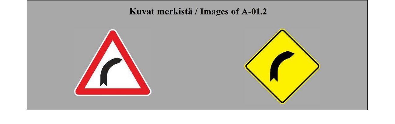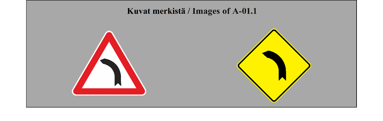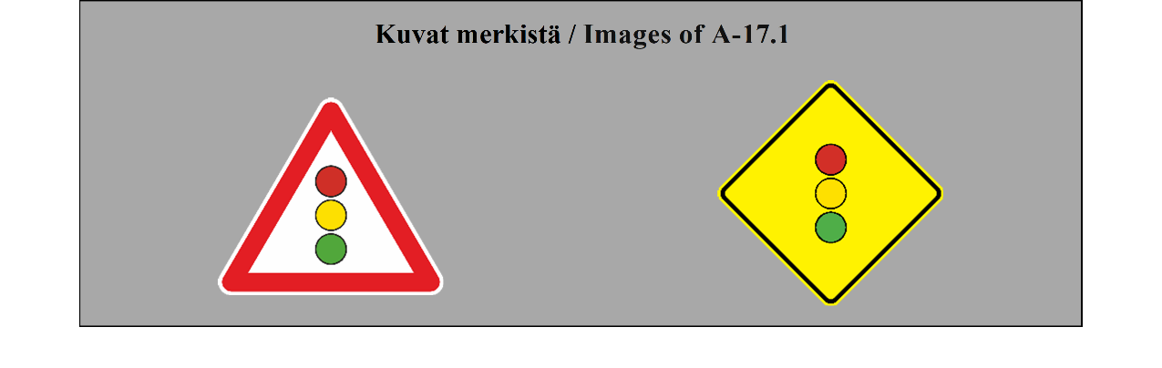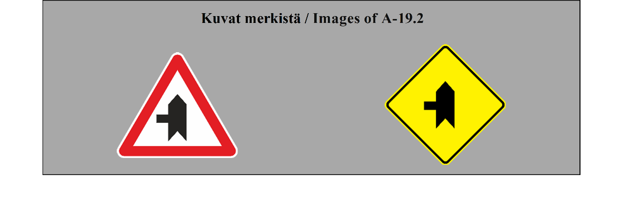 II luku LIIKENNEMERKIT 5 ARTIKLA 1. Tämän yleissopimuksen määrittelemässä järjestelmässä erotetaan seuraavat liikennemerkkilajit: (a) varoitusmerkit: näiden merkkien tarkoituksena on varoittaa tienkäyttäjiä tiellä olevasta vaarasta ja osoittaa heille sen laatu; (b) sääntelymerkit: näiden merkkien tarkoituksena on tiedottaa tienkäyttäjille erityisistä velvoitteista, rajoituksista tai kielloista, joita heidän on noudatettava; nämä merkit jaetaan (i) etuajo-oikeutta säänteleviin merkkeihin; (ii) kielto- ja rajoitusmerkkeihin; (iii) määräysmerkkeihin; (iv) sääntömerkkeihin; (c) tiedotusmerkit: näiden merkkien tarkoituksena on ohjata teillä liikkuvia tienkäyttäjiä tai antaa heille muita tarpeellisia tietoja; ne jakautuvat (i) opastuspisteiden ja palvelukohteiden opastusmerkkeihin; (ii) muihin opastusmerkkeihin: ennakkotiedotusmerkit; tienviitat; tien tunnistusmerkit; paikkakuntakilvet; varmennusmerkit; osoitusmerkit; (d) lisäkilvet: nämä muiden merkkien kanssa käytettävät merkit antavat lisätietoja. 2. Tämän yleissopimuksen salliessa valinnan mahdollisuuden useiden merkkien tai tunnusten välillä (a) sopimuspuolet sitoutuvat ottamaan käyttöön koko alueellaan ainoastaan yhden tällaisen merkin tai tunnuksen ja vain yhden tällaisen värin liitteessä 1 olevassa A osassa ja liitteessä 1 olevassa C osassa mainituille pysyville merkeille ja liitteessä 1 olevassa B osassa mainituille asiaan liittyville pysyville merkeille sekä vain yhden tällaisen värin väliaikaisille merkeille; (b) sopimuspuolten on pyrittävä tekemään alueellisia sopimuksia yhteisistä valinnoista; (c) tämän yleissopimuksen 3 artiklan 3 kohdan määräykset koskevat sellaisia merkki- ja tunnuslajeja, joita ei valita. | Chapter II ROAD SIGNS ARTICLE 5 1. The system prescribed in this Convention differentiates between the following classes of road signs: (a) Danger warning signs: these signs are intended to warn road users of a danger on the road and to inform them of its nature; (b) Regulatory signs: these signs are intended to inform road users of special obligations, restrictions or prohibitions with which they must comply; they are subdivided into: (i) Priority signs; (ii) Prohibitory and restrictive signs; (iii) Mandatory signs; (iv) Special regulation signs; (c) Informative signs: these signs are intended to guide road users while they are travelling or to provide them with other information which may be useful; they are subdivided into: (i) Information, facilities or service signs; (ii) Other information signs: Advance direction signs; Direction signs; Road identification signs; Place identification signs; Confirmatory signs; Indication signs; (d) Additional panels: these signs, only used with other signs, provide additional information. 2. Where this Convention allows a choice between several signs, several symbols, or several colours, (a) Contracting Parties undertake to adopt only one of such signs or symbols for the whole of their territories and only one of such colours for the permanent signs of Annex 1, section A and Annex 1, section C and the relevant permanent signs of Annex 1, section B for the whole of their territories and only one of such colours for the temporary signs for the whole of their territories; (b) Contracting Parties shall endeavour to reach regional agreements on the same choice; (c) The provisions of Article 3, paragraph 3, of this Convention shall apply to signs and symbols of the types which are not chosen. |