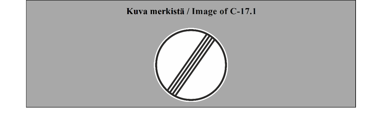11 ARTIKLA Kielto- ja rajoitusmerkit Tämän yleissopimuksen liitteessä 1 olevassa C osassa kuvataan kielto- ja rajoitusmerkit ja annetaan niiden merkitykset. Siinä kuvataan myös merkit, jotka osoittavat tällaisen kiellon tai rajoituksen loppumisen. | ARTICLE 11 Prohibitory and restrictive signs Section C of Annex l to this Convention describes the prohibitory and restrictive signs and gives their meaning. It also describes the signs notifying the end of these prohibitions and restrictions or of any one of them. |