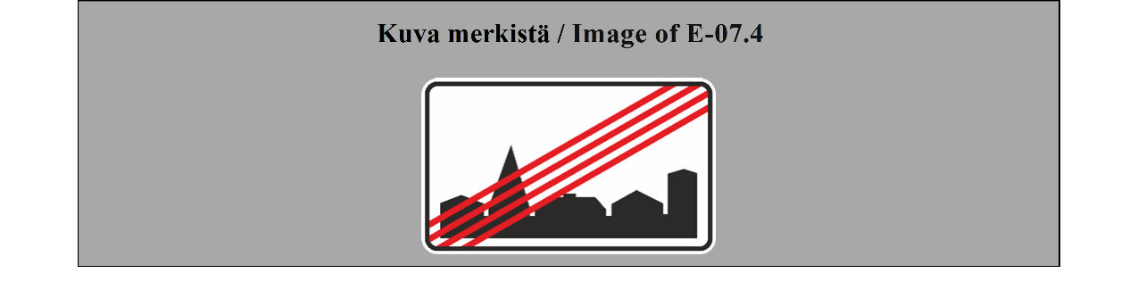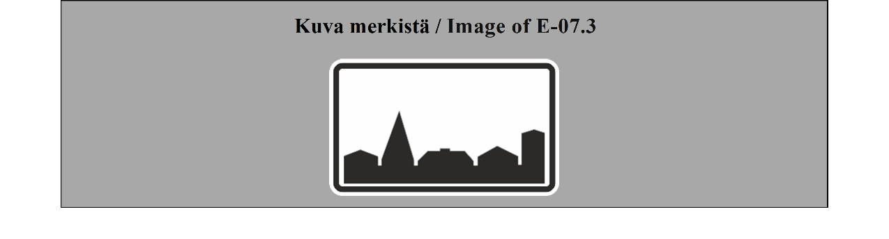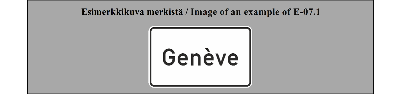 18 ARTIKLA Paikkakuntakilvet Paikkakuntakilpiä voidaan käyttää ilmaisemaan kahden valtion tai saman valtion kahden hallintoalueen välistä rajaa tai joen, solan, näköalapaikan tai muun sellaisen nimeä. Näiden merkkien on erottava selvästi merkeistä, jotka mainitaan liitteessä 1 olevan E osan II jakson 7 kohdassa (TAAJAMA ALKAA ja TAAJAMA PÄÄTTYY). | ARTICLE 18 Place identification signs Place identification signs may be used placed to show the frontier between two countries or the boundary between two administrative divisions of the same country or the name of a river, mountain pass, beauty spot, etc. These signs shall differ conspicuously from the signs referred to in Annex 1, section E, subsection II, paragraph 7 (BEGINNING OF A BUILT UP AREA and END OF A BUILT-UP AREA). |
