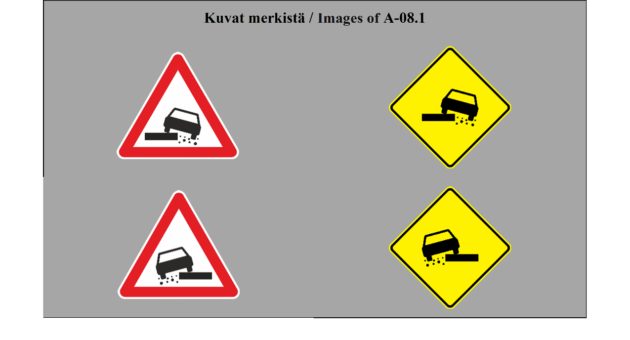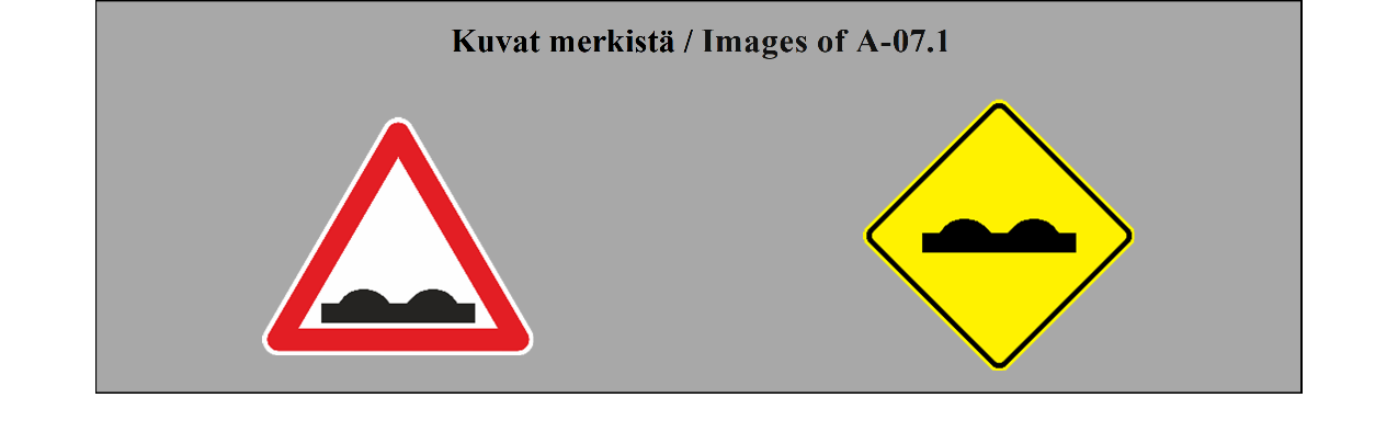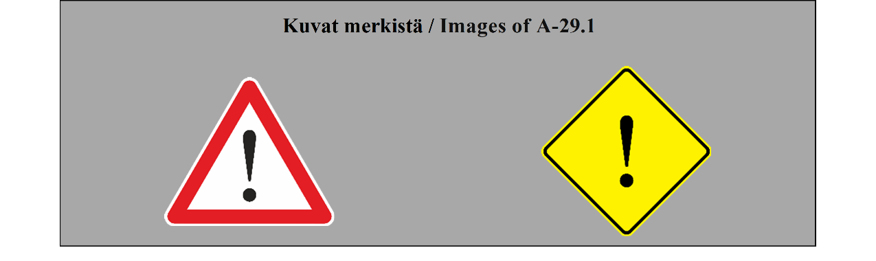 VAROITUSMERKIT 9 ARTIKLA 1. Tämän yleissopimuksen liitteessä 1 olevassa A osassa esitetään varoitusmerkkien mallit, kuvataan varoitusmerkit ja annetaan niiden merkitys. A osan II jaksossa esitetään näihin merkkeihin sijoitettavat tunnukset ja annetaan ohjeita merkkien käytöstä. Tämän yleissopimuksen 46 artiklan 2 kohdan mukaisesti on jokaisen valtion ilmoitettava pääsihteerille, onko se valinnut mallin 1 (tasasivuinen kolmio) vai mallin 2 (neliö, jonka yksi halkaisija on pystysuuntainen) mukaiset varoitusmerkit käyttöönsä. 2. Varoitusmerkkien lukumäärää ei saa lisätä tarpeettomasti, vaan ne on sijoitettava siten, että ne varoittavat tiellä mahdollisesti olevista vaarallisista paikoista, joita tarpeellista varovaisuutta noudattavan kuljettajan on vaikea havaita ajoissa. 3. Varoitusmerkit on sijoitettava sellaisen välimatkan päähän vaarakohdasta, että ne ovat mahdollisimman tehokkaita niin päivällä kuin yölläkin ottaen huomioon tie- ja liikenneolosuhteet, kuten ajoneuvojen tavanomaisen nopeuden sekä liikennemerkin havaitsemisetäisyyden. 4. Liikennemerkin ja vaarallisen tieosuuden alkamiskohdan välimatka on ilmoitettava, jos kuljettajien on mahdotonta arvioida merkin ja vaarallisen tieosuuden alkamiskohdan välistä etäisyyttä tai jos tämä etäisyys poikkeaa tavanomaisesti odotettavissa olevasta. Tämä välimatka on ilmaistava liitteessä 1 olevan H osan II jakson 1 kohdan (ETÄISYYS-LISÄKILPI) mukaisesti. 5. Varoitusmerkit voidaan toistaa etenkin moottoriteillä tai muilla teillä, joihin sovelletaan moottoriteitä koskevia määräyksiä. Missä merkit on toistettu, on niiden ja vaarallisen tieosuuden alkamiskohdan välinen etäisyys ilmaistava tämän artiklan 4 kohdan määräysten mukaisesti. Kuitenkin jos kyseessä ovat tasoristeyksistä ja avattavista silloista varoittavat ja etäisyyden niihin ilmoittavat merkit, sopimuspuolet voivat käyttää erityisiä tasoristeysten ja avattavien siltojen merkkejä, jotka on kuvattu liitteessä 1 olevan A osan II jakson 27 kohdassa (TASORISTEYSTEN TAI AVATTAVIEN SILTOJEN LÄHESTYMINEN). 6. Jos varoitusmerkkiä käytetään ilmoittamaan tietyn pituisesta vaarallisesta tieosuudesta (esimerkiksi sarjasta vaarallisia mutkia tai huonokuntoisesta ajoradan osasta) ja jos katsotaan tarpeelliseksi ilmaista tämän osuuden pituus, se on tehtävä tämän yleissopimuksen liitteessä 1 olevan H osan II jakson 1 kohdan (PITUUDEN OSOITTAVA LISÄKILPI) mukaisesti. | DANGER WARNING SIGNS ARTICLE 9 1. Section A of Annex 1 to this Convention provides the models for danger warning signs, describes the danger warning signs and gives their meaning. Section A, subsection II indicates the symbols to be placed on these signs and gives some instructions for their use. In conformity with Article 46, paragraph 2 of this Convention, each State shall notify the Secretary-General whether it has selected model one (equilateral triangle) or model two (square with one diagonal vertical) for danger warning signs. 2. The number of danger warning signs shall not be increased unnecessarily, but such signs shall be sited to give warning of possible road hazards which are difficult for a driver proceeding with due caution to perceive in time. 3. Danger warning signs shall be placed at such distance from the danger point as will make them most effective both by day and by night, having regard to road and traffic conditions, including the normal speed of vehicles and the distance at which the sign is visible. 4. The distance between the sign and the beginning of a dangerous section of road shall be given when the distance between the sign and the beginning of the dangerous section of road cannot be judged by drivers or is not what they might normally expect. This distance shall be shown in accordance with Annex 1, section H, subsection II, paragraph 1 (DISTANCE PANEL). 5. Danger warning signs may be repeated, particularly on motorways and roads treated as motorways. Where they are repeated, the distance between the sign and the beginning of the dangerous section of road shall be shown in accordance with the provisions of paragraph 4 of this Article. However, with respect to danger warning signs giving warning of and distance to level crossings and opening bridges, Contracting Parties may use signs specific for approaches to level crossings and opening bridges, which are described in Annex 1, section A, subsection II, paragraph 27 (APPROACHES TO LEVEL CROSSINGS OR OPENING BRIDGES). 6. If a danger warning sign is used to give warning of a danger on a section of road of some length (e.g. a series of dangerous bends or a section of carriageway in bad condition) and if it is considered desirable to show the length of that section, this shall be done in accordance with Annex l, section H, subsection II, paragraph 1 (LENGTH INDICATION PANEL. |