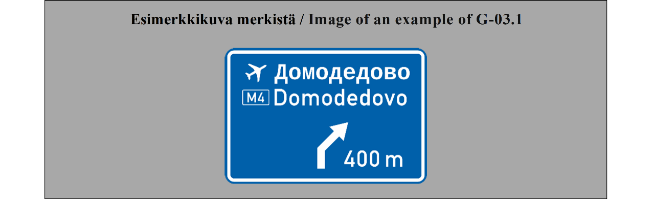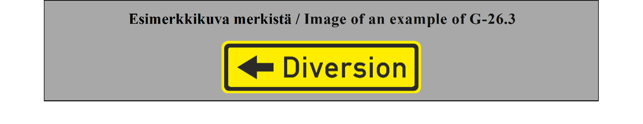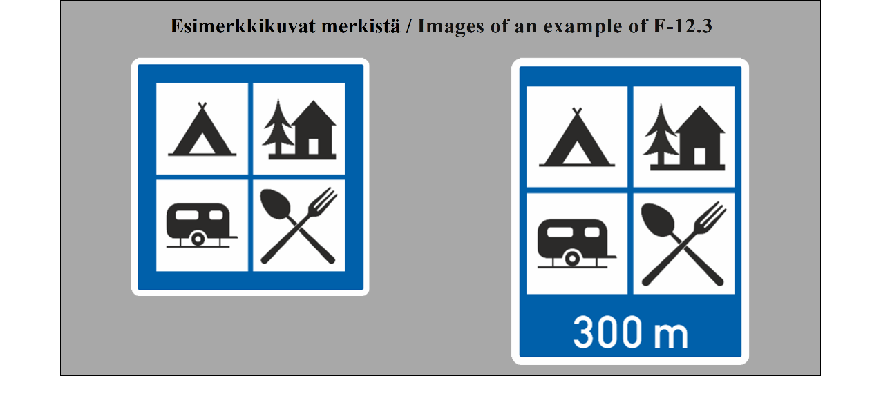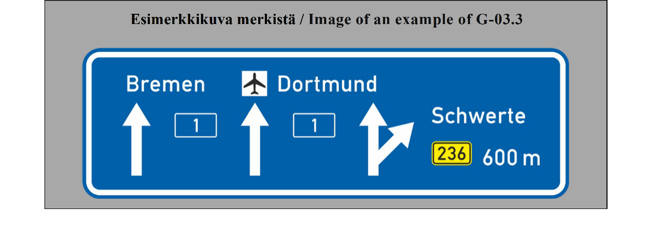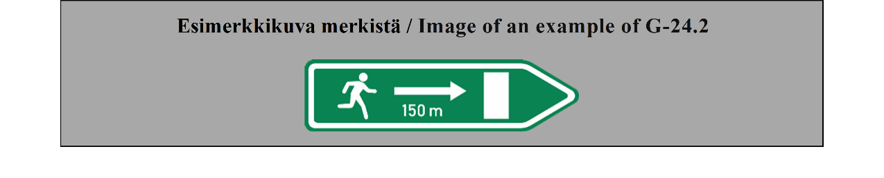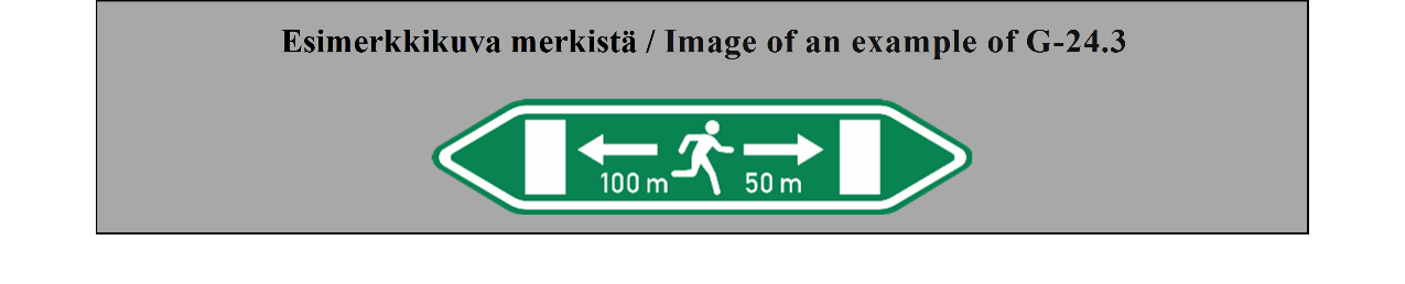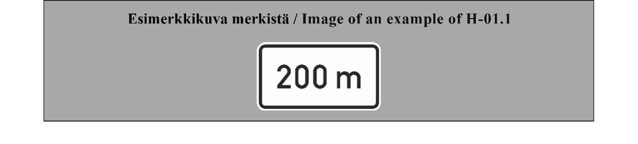 15 ARTIKLA Ennakkotiedotusmerkit Ennakkotiedotusmerkit on sijoitettava sellaiselle etäisyydelle risteyksestä, että ne ovat mahdollisimman tehokkaat sekä päivällä että yöllä, ja niiden sijoituksessa on otettava huomioon tie- ja liikenneolosuhteet, kuten ajoneuvojen tavanomainen nopeus ja liikennemerkin näkyvyysetäisyys; tämän etäisyyden ei tarvitse olla yli noin 50 metriä (55 jaardia) taajamissa, mutta sen on oltava vähintään 500 metriä (550 jaardia) moottoriteillä ja muilla nopealiikenteisillä teillä. Nämä merkit voidaan toistaa. | ARTICLE 15 Advance direction signs Advance direction signs shall be placed at such distance from the intersection as will make them most effective both by day and by night, having regard to road and traffic conditions, including the normal speed of vehicles and the distance at which the sign is visible; this distance need not exceed about 50 meters (55 yards) in built-up areas but shall be not less than 500 meters (550 yards) on motorways and other roads carrying fast traffic. The signs may be repeated. |