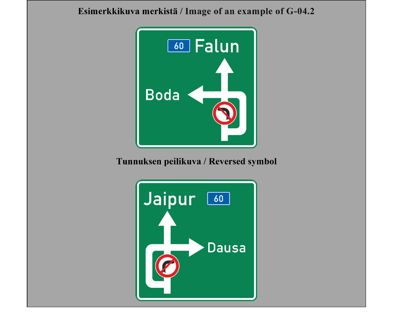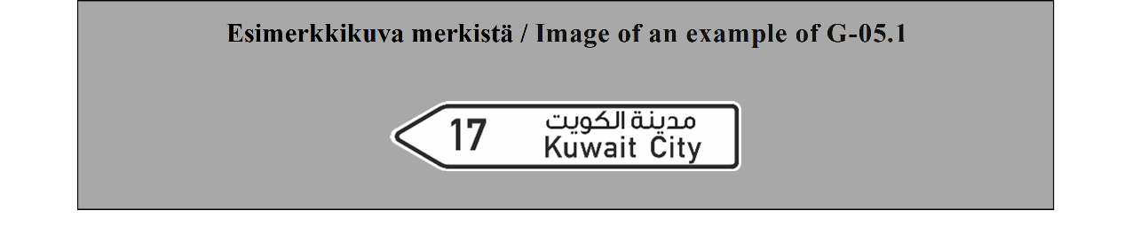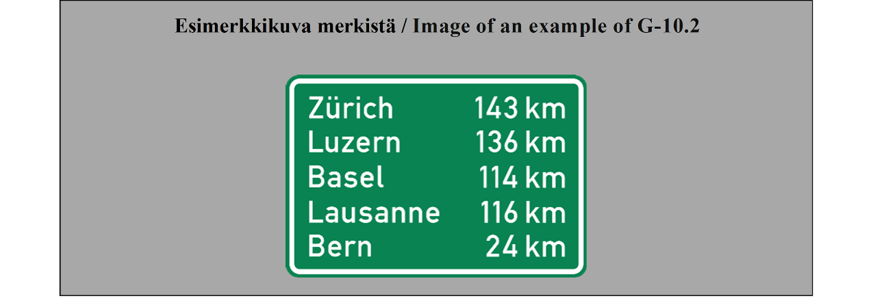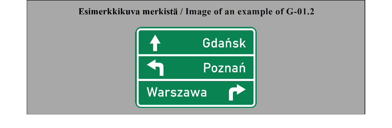 19 ARTIKLA Varmennusmerkit Varmennusmerkkejä käytetään, milloin toimivaltaiset viranomaiset katsovat sen tarpeelliseksi, varmentamaan tien suunta, esimerkiksi suurten taajamien ulosmenoteillä. | ARTICLE 19 Confirmatory signs Confirmatory signs are placed to confirm the direction of a road where the competent authorities consider it necessary, e.g. at the exit from a large built-up area. |