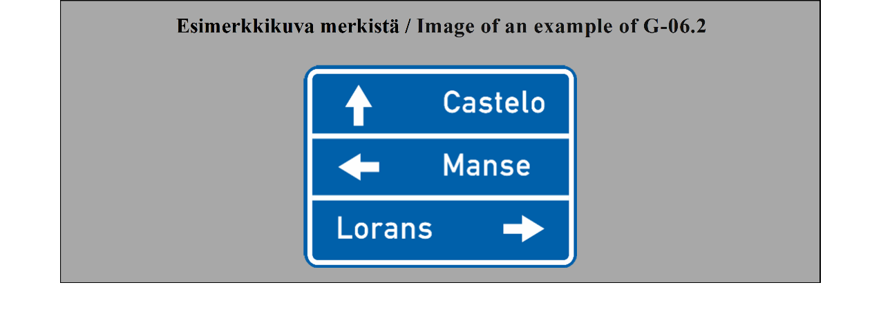 16 ARTIKLA Tienviitat 1. Tienviitat on sijoitettava lähelle risteystä tai risteykseen, ja niissä voi olla usean paikan nimet. | ARTICLE 16 Direction signs 1. Direction signs shall be placed near or at an intersection and may bear the names of several places of them. |