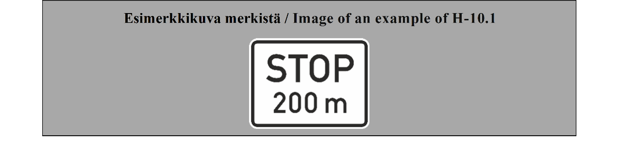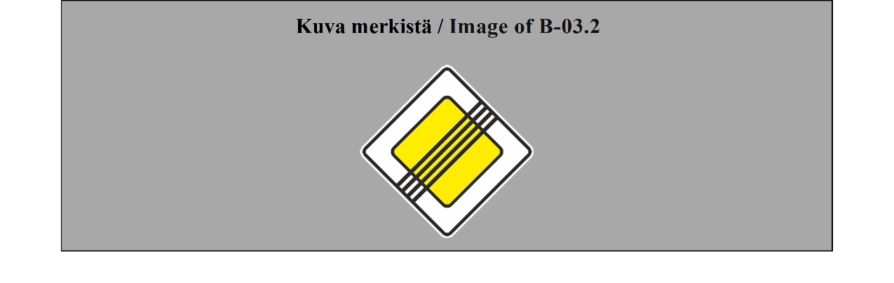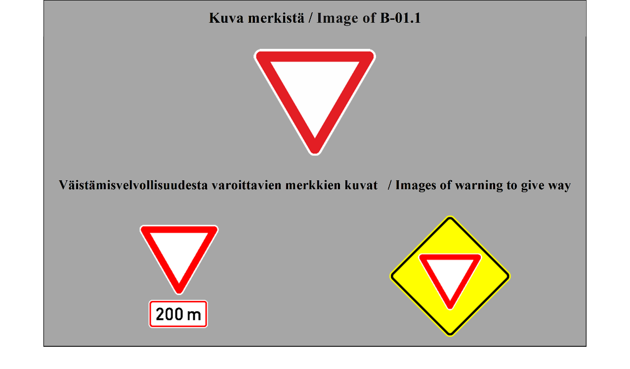 SÄÄNTELYMERKIT 10 ARTIKLA Etuajo-oikeutta sääntelevät merkit 1. Merkit, jotka osoittavat tai ilmoittavat tienkäyttäjille risteyksissä voimassa olevat erityiset etuajo-oikeussäännöt, esitetään liitteessä 1 olevan B osan 1–4 kohdassa. 2. Jos mahdollista, liitteessä 1 olevan B osan 1 kohdassa (VÄISTÄ) ja 2 kohdassa (STOP) kuvatut merkit on asetettava risteykseen siihen kohtaan, jossa ajo-neuvojen on pysähdyttävä tai jota ne eivät saa väistäessään ylittää. Ne voidaan asettaa risteyksessä muuhun kohtaan, jos toimivaltaiset viranomaiset katsovat sen välttämättömäksi. Merkkiä STOP on käytettävä vain, jos toimivaltaiset viranomaiset pitävät tarpeellisena velvoittaa kuljettajat pysähtymään etenkin huonon näkyvyyden takia niille risteävän tien osille, jotka ovat risteyksen jommallakummalla puolella. 3. Liitteessä 1 olevan B osan 3 kohdassa kuvattu merkki (ETUAJO-OIKEUTETTU TIE) voidaan sijoittaa tien alkuun ja toistaa jokaisen risteyksen jälkeen; se voidaan myös sijoittaa ennen risteystä tai risteykseen. 4. Liitteessä 1 olevan B osan 4 kohdassa kuvattu merkki (ETUAJO-OIKEUDEN PÄÄTTYMINEN) on sijoitettava ennen paikkaa, jossa liitteessä 1 olevan B osan 3 kohdassa kuvatun merkin (ETUAJO-OIKEUTETTU TIE) vaikutus päättyy. 5. Liitteessä 1 olevan B osan 4 kohdassa kuvattu merkki (ETUAJO-OIKEUDEN PÄÄTTYMINEN) voidaan toistaa kerran tai useammin ennen kohtaa, jossa etuajo-oikeus lakkaa; tällöin on ennen tätä kohtaa sijoitetussa merkissä tai merkeissä oltava liitteessä 1 olevan H osan 1 kohdassa kuvattu merkki (ETÄISYYS-LISÄKILPI). 6. Jos varoitus risteyksestä on etuajo-oikeutetulla tiellä annettu liitteessä 1 olevan A osan II jakson 19 kohdassa kuvatulla merkillä (RISTEYS VÄISTÄMISVELVOLLISEN TIEN KANSSA) tai jos risteyksessä tie on etuajo-oikeutettu ja sellaiseksi merkitty liitteessä 1 olevan B osan 3 kohdassa kuvatulla merkillä (ETUAJO-OIKEUTETTU TIE), liitteessä 1 olevan B osan 1 kohdassa (VÄISTÄ) ja 2 kohdassa (STOP) kuvatut merkit on sijoitettava risteyksen kaikille muille teille; kyseisten merkkien sijoittaminen ei kuitenkaan ole pakollista sellaisilla teillä kuin poluilla ja tilusteillä, joilla ajavien kuljettajien on näiden merkkien puuttuessakin väistettävä risteyksessä. 7. Merkit, joilla ilmoitetaan tienkäyttäjille etuajo-oikeudesta kapeilla tieosuuksilla, kuvataan liitteessä 1 olevan B osan 5 kohdassa (ETUAJO-OIKEUS KOHTAAVALLA LIIKENTEELLÄ) ja 6 kohdassa (ETUAJO-OIKEUS KOHTAAVAAN LIIKENTEESEEN NÄHDEN). | REGULATORY SIGNS ARTICLE 10 Priority signs 1. The signs for notifying or informing road users of the special rules of priority at intersections are described in Annex 1, section B, paragraphs 1 to 4. 2. The signs described in Annex 1, section B, paragraphs 1 (GIVE WAY) and 2 (STOP) shall be placed at the intersection, if possible level with the point at which vehicles must stop or beyond which they must not pass when giving way. They may be placed elsewhere than at an intersection if the competent authorities consider it necessary. The STOP sign shall be set up only if the competent authorities consider it advisable to require drivers to stop, in particular because of the poor visibility, for drivers, of the sections of the road, on either side of the intersection, which they are approaching. 3. The sign described in Annex 1, section B, paragraph 3 (PRIORITY ROAD) may be placed at the beginning of the road and repeated after each intersection; it may also be set up before or at the intersection. 4. The sign described in Annex 1, section B, paragraph 4 (END OF PRIORITY) shall be placed at the approach to the point from where the sign of Annex 1, section B, paragraph 3 (PRIORITY ROAD) ceases to apply. 5. The sign of Annex 1, section B, paragraph 4 (END OF PRIORITY) may be repeated one or more times in advance of the point where the priority ends; the sign or signs set up in advance of that point shall be placed together with an additional panel described in Annex 1, section H, paragraph 1 (DISTANCE PANEL). 6. If warning of an intersection is given on a priority road by danger warning signs described in Annex 1, section A, subsection II, paragraph 19 (INTERSECTION WITH A GIVE WAY ROAD), or if at the intersection the road is a priority road and has been signposted as such by the sign described in Annex 1, section B, paragraph 3 (PRIORITY ROAD), the signs described in Annex 1, section B, paragraphs 1 (GIVE WAY) and 2 (STOP) shall be placed at the intersection on all the other roads; however, the placing of those signs shall not be mandatory on roads such as paths or earth-tracks where drivers are required to give way at the intersection even in the absence of such signs. 7. The signs for informing road users of a rule of priority on narrow sections of road are described in Annex 1, section B, paragraphs 5 (PRIORITY FOR ONCOMING TRAFFIC) and 6 (PRIORITY OVER ONCOMING TRAFFIC). |