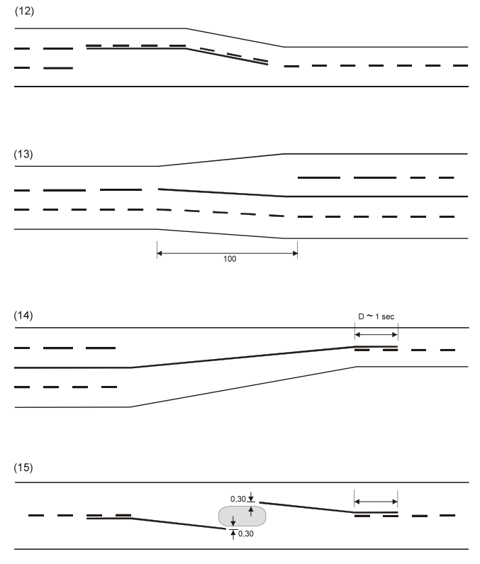 29 bis ARTIKLA 1. Jos pysyviä tiemerkintöjä muutetaan tietyksi ajaksi, erityisesti tietöiden tai kiertoteiden takia, väliaikaiset merkinnät on tehtävä eri väreillä kuin pysyvät merkinnät. 2. Väliaikaiset merkinnät ovat pysyviin merkintöihin nähden etusijalla, ja tienkäyttäjien on noudatettava niitä. Jos pysyviä ja väliaikaisia merkintöjä on näkyvissä samanaikaisesti ja ne voisivat aiheuttaa sekaannusta, pysyvät merkinnät on peitettävä tai poistettava. 3. Väliaikaisten merkintöjen on suositeltavaa olla heijastavia, ja niitä voidaan täydentää merkkivaloilla tai heijastimilla liikenteenohjauksen parantamiseksi. | ARTICLE 29 bis 1. When permanent road markings are to be modified for a specific period, in particular because of road works or diversions, temporary markings shall be applied in colours different from the colours used for permanent markings. 2. Temporary markings shall take precedence over permanent markings and road users are required to conform to them. When the simultaneous presence of permanent and temporary road markings could be a source of confusion, the permanent markings shall be covered over or removed. 3. Temporary markings shall preferably be retroreflective and may be supplemented by beacons, cat's eyes or reflectors with a view to improving traffic guidance. |