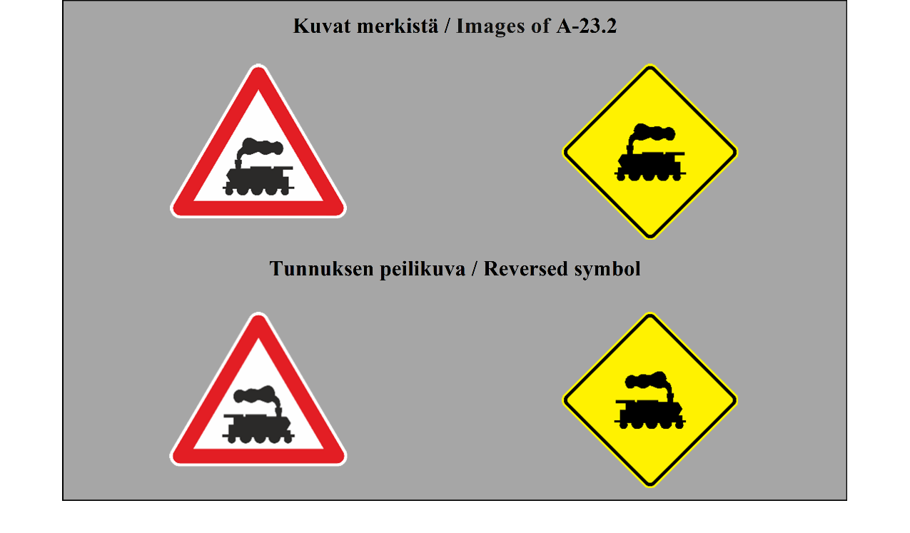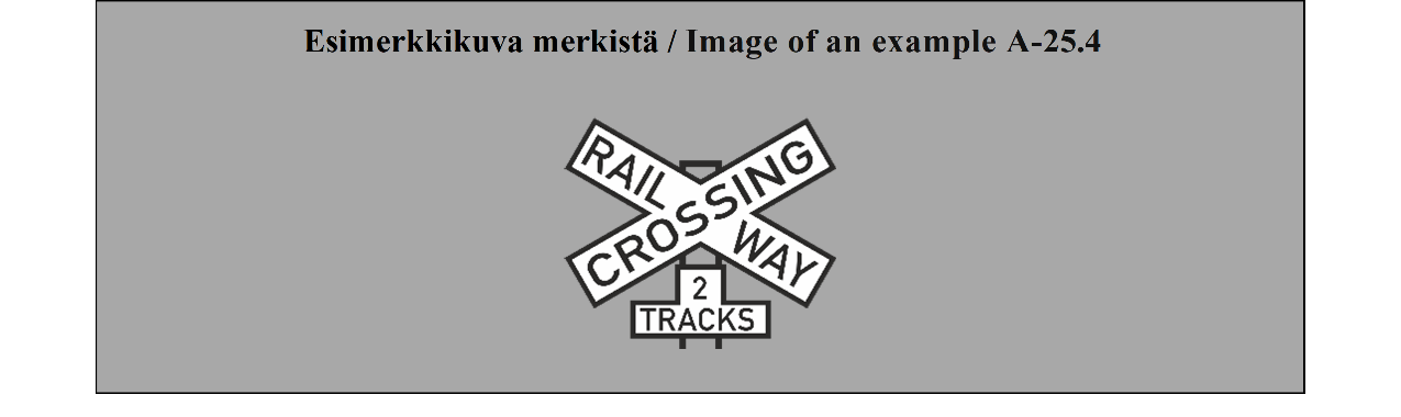 35 ARTIKLA 1. Tasoristeyksissä olevat puomit ja puolipuomit on merkittävä selvästi maalaamalla niihin punavalkoiset, punakeltaiset, mustavalkoiset tai mustakeltaiset raidat. Ne voidaan kuitenkin maalata kokonaan valkoisiksi tai keltaisiksi, jos niiden keskelle asetetaan suuri punainen pyöreä levy. 2. Kaikissa puomeja tai puolipuomeja vailla olevissa tasoristeyksissä on oltava rautatielinjan välittömässä läheisyydessä liitteessä 1 olevan A osan II jakson 24 kohdassa kuvattu merkki (MUU TASORISTEYS). Jos tasoristeyksessä on junien lähestymisestä varoittava liikennevalo tai liitteessä 1 olevan B osan 2 kohdassa kuvattu merkki (STOP), merkki TASORISTEYS on sijoitettava samaan kannattimeen kuin liikennevalo tai merkki STOP. Merkin TASORISTEYS sijoittaminen ei ole pakollista (a) tien ja rautatien muodostamiin risteyksiin, joissa rautatieliikenne etenee hyvin hitaasti ja joissa rautatievirkailija ohjaa liikennettä tarpeellisin käsimerkein; eikä (b) rautatien ja polun tai erittäin vähäliikenteisen tilustien risteykseen. | ARTICLE 35 1. The gates and half-gates of level crossings shall be clearly marked in alternate stripes of red and white, red and yellow, black and white, or black and yellow. They may, however, be coloured white or yellow only, provided that a large red disc is displayed at the centre. 2. At all level crossings which have neither gates nor half-gates there shall be placed, in the immediate vicinity of the railway, the sign described in Annex 1, section A, subsection II, paragraph 24 (OTHER LEVEL CROSSINGS). If there is a light signal giving warning of the approach of trains or sign described in Annex 1, section B, paragraph 2 (STOP), LEVEL CROSSINGS sign shall be placed on the same support as the light signal or STOP sign. Placing of LEVEL CROSSINGS sign is not mandatory at: (a) An intersection between a road and a railway at which rail traffic proceeds very slowly and road traffic is regulated by a railway officer making the necessary hand signals; or (b) An intersection between a railway and either an earth-track (dirt road) where traffic is very light, or a footpath. |