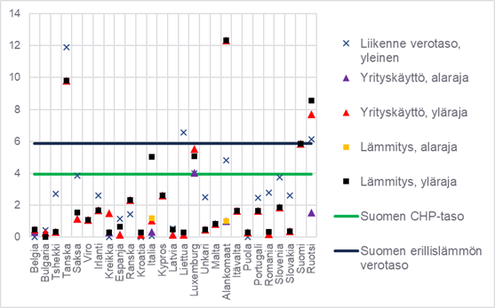Kuviossa 1 on esitetty maakaasun verotasoja Suomessa ja muissa EU-maissa Taxes in Europe -tietokannan mukaan. Esitettyjen verotasoihin on syytä suhtautua varauksella, sillä verotasoissa ei ole kaikilta osin huomioitu mahdollisia palautuksia, eikä muita maakaasuun liittyviä maksuja. Maakaasun verotasot eroavat useassa maassa sen mukaan käytetäänkö maakaasu liikenteessä, teollisuuden lämmöntuotannossa, kaukolämmön tuotannossa tai suoraan rakennusten erillislämmityksessä. Lisäksi joissakin maissa maakaasun verotaso eroaa myös käytön määrän mukaan tai sen mukaan kuuluuko polttoaineen kulutus päästökauppaan vai ei. Tätä vaihtelua on kuvattu kuviossa verotasojen ala- ja ylärajalla.