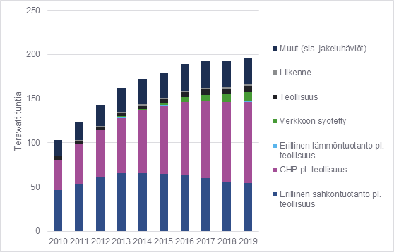 Vuonna 2019 Tilastokeskuksen mukaan maakaasua käytettiin yhteensä noin 25 terawattituntia ja biokaasua yhteensä noin 2,1 terawattituntia. Biokaasua syötettiin siirto- ja jakeluverkkoihin vuonna 2019 noin 0,1 terawattituntia, joka on noin viisi prosenttia biokaasun kokonaiskulutuksesta. Maakaasun verollinen kulutus vuonna 2019 oli noin 8 terawattituntia, josta yhdistetyn tuotannon osuus oli noin kolme viidesosaa.