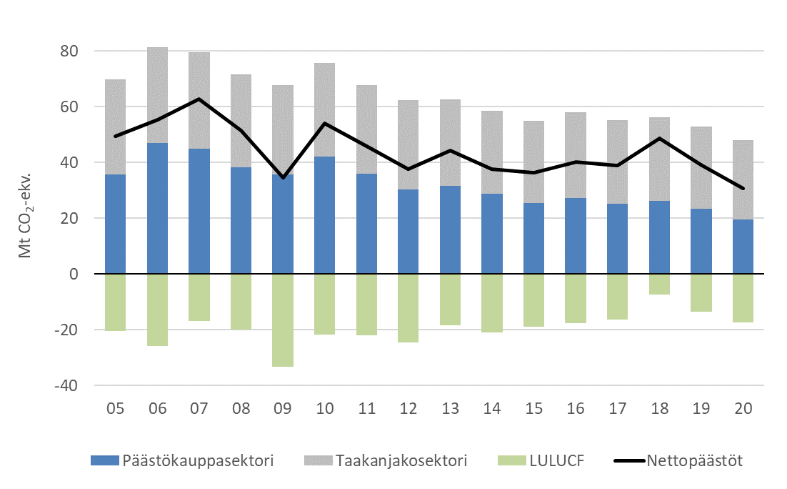 Kuva 1. Päästökauppa-, taakanjako- ja maankäyttö (LULUCF) -sektoreiden kasvihuonekaasupäästöt vuodesta 2005 vuoteen 2020. Vuoden 2020 tieto on ennakko. Lähde: Tilastokeskus.
