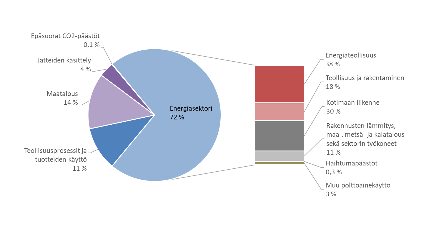 Suomen kasvihuonekaasujen kokonaispäästöt ilman maankäyttösektoria olivat vuonna 2019 Tilastokeskuksen inventaarion mukaan yhteensä 52,8 miljoonaa hiilidioksidiekvivalenttitonnia (CO2-ekv.). Tilastokeskuksen joulukuussa 2021 julkaistun ennakkotiedon mukaan vuoden 2020 kokonaispäästöt olivat laskeneet tasolle 48,1 miljoonaa tonnia CO2-ekv. Kokonaispäästöt ovat vähentyneet 32 prosenttia vuoden 1990 tasosta. Päästöt ovat laskeneet 44 prosenttia vuodesta 2003, jolloin päästöt olivat korkeimmillaan vuosien 1990—2020 välisenä aikana. Tämän lisäksi maankäyttö, maankäytön muutos ja metsätalous -sektorin, eli niin kutsutun LULUCF-sektorin päästöjen ja poistumien summa eli nettonielu oli ennakkotiedon mukaan vuonna 2020 -17,2 miljoonaa hiilidioksidiekvivalenttitonnia. LULUCF-sektorin nettonielun vuosittaiset vaihtelut ovat suuret johtuen erityisesti vaihteluista hakkuumäärissä. Tarkastelujaksolla 1990—2020 nettonielun keskiarvo on ollut -18,6 miljoonaa hiilidioksidiekvivalenttitonnia ja suurimmillaan nettonielu on ollut vuonna 2009 yli -33 miljoonaa hiilidioksidiekvivalenttitonnia.