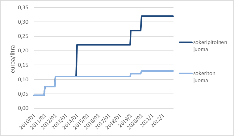 Virvoitusjuomaveron verotasojen kehitys on kuvattu alla kuvassa 1, josta ilmenee, kuinka veroero sokeripitoisten ja sokerittomien juomien välillä on vuodesta 2014 vuoteen 2020 kasvanut 11 sentistä litralta yli puolitoistakertaiseksi 19 senttiin litralta.