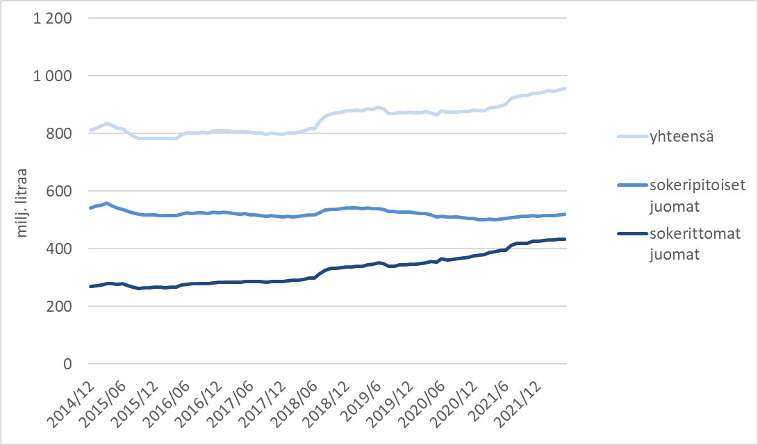 Kuva 2. Verotettujen sokeripitoisten ja sokerittomien juomien määrän kehitys, liukuva 12 kuukauden summa