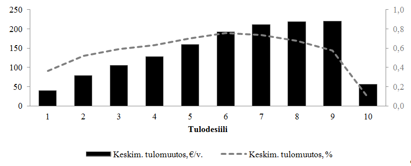 Alla olevaan kuvioon on koottu tuloveroperusteisiin tässä esityksessä valtion progressiiviseen tuloveroasteikkoon, työtulovähennykseen ja perusvähennykseen, asuntolainojen korkovähennysoikeuteen ja korotettuun pääomatuloverokantaan tehtyjen muutosehdotusten yhteisvaikutukset tulodesiileittäin. Kuviosta käy ilmi että, verotus kevenee kaikissa tulodesiileissä hieman. Vaikutus on suurin tulodesiileissä 6—9, eli keskituloilla kotitalouksilla. Kuviossa esitetyt muutokset on laskettu OECD:n modifioidun ekvivalenssi-asteikon mukaisilla kotitalouskohtaisilla ekvivalenteilla tuloilla.