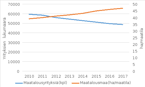 Kuvio: Maatalous- ja puutarhayritykset sekä niiden käytössä oleva maatalousmaa 2010—2017. Aktiiviset tilat, joiden taloudellinen koko on vähintään 2 000 euroa.