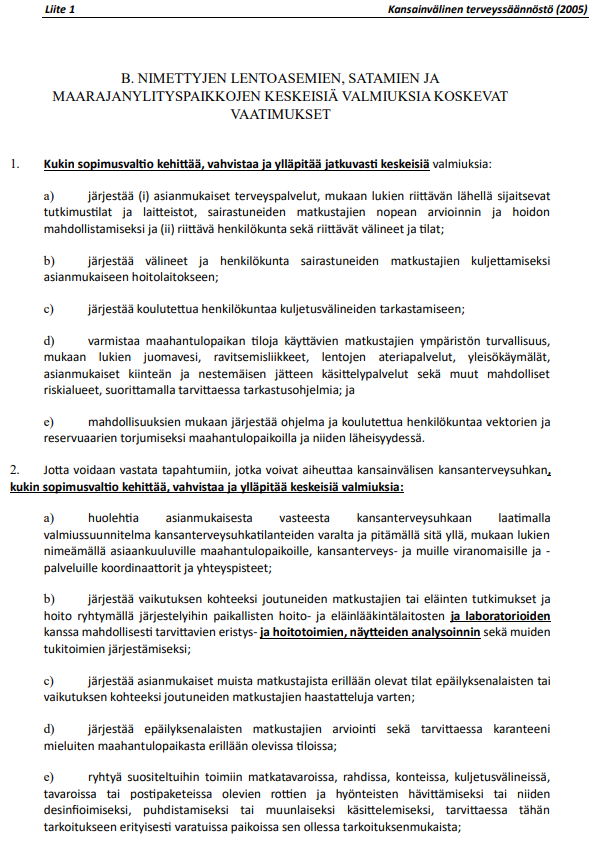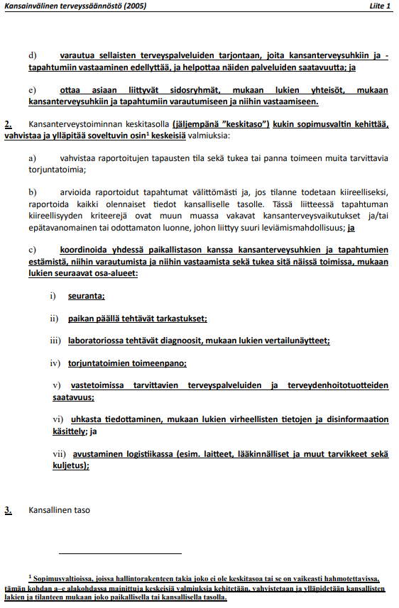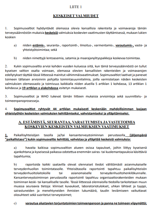 Artiklaan tehtiin täsmennys, jonka mukaan IHR:n tarkoituksena on tautien kansainvälisen leviämisen ehkäisyn, torjunnan ja hallinnan lisäksi varautuminen. Varautumisesta säädetään kansallisesti useissa eri laeissa, kuten esimerkiksi tartuntatautilaissa (1227/2016), sosiaali- ja terveydenhuollon järjestämisestä annetussa laissa (612/2021), terveydensuojelulaissa (763/1994) ja valmiuslaissa (1552/2011) lisäksi Ahvenanmaan maakunnassa terveydenhuollosta annetussa maakuntalaissa Landskapslag (2011:114) om hälso- och sjukvård, 44§. säädetään osaltaan varautumissuunnitelman laatimisesta. Tartuntatautilaissa säädetään viranomaisten velvollisuudesta torjua tartuntatauteja ja varautua terveydenhuollon häiriötilanteisiin. Tartuntatautilaissa säädetään myös kansainvälisestä yhteistyöstä tartuntatautien torjunnassa. Sosiaali- ja terveydenhuollon järjestämisestä annetussa laissa säädetään valtioneuvoston velvollisuudesta vahvistaa joka neljäs vuosi alueelliset ja valtakunnalliset tavoitteet valmiuden ja varautumisen toteuttamiseksi. Lisäksi laissa säädetään hyvinvointialueiden ja yhteistyöalueiden varautumisvelvoitteista ja valmiussuunnitelmasta. Valmiuslaissa säädetään varautumisen johtamisesta ja valvonnasta sekä yleisistä varautumisvelvoitteista erilaisiin poikkeusoloihin. Kansainvälisen terveyssäännöstön muutokset eivät aiheuta muutostarpeita em. lainsäädäntöön.