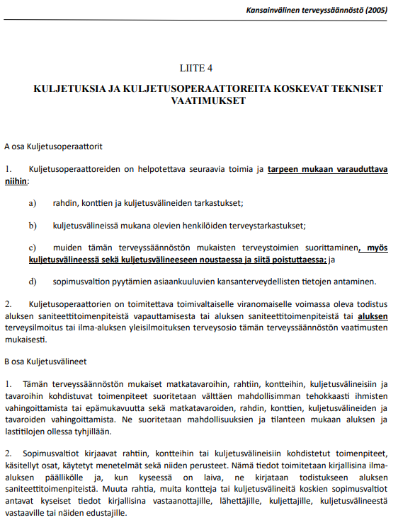 Tämä hallituksen esitys koskee IHR:ään WHO:n 77. yleiskokouksessa päätöslauselmalla WHA77.17 hyväksyttyjä muutoksia, joten tässä jaksossa selostetaan vain näiden muutosten sisältöä ja tehdään selkoa niiden suhteesta Suomen lainsäädäntöön. Niiden IHR:n määräysten, joita ei ole muutettu, sisältöä ei tässä jaksossa selosteta. Myöskään WHO:n 75. yleiskokouksessa vuonna 2022 päätöslauselmalla WHA75.12 hyväksyttyjen IHR:n 55, 59, 61, 62 ja 63 artikloihin tehtyjen muutosten sisältöä ei tässä jaksossa selosteta, sillä muutokset on jo hyväksytty kansallisesti ja ne ovat tulleet voimaan 31.5.2024 (SopS 17/2024). Tähän hallituksen esitykseen on sisällytetty koko IHR:n konsolidoitu teksti edellä mainittuine muutoksineen niin, että IHR:ään WHO:n 77. yleiskokouksessa päätöslauselmalla WHA77.17 hyväksytyt muutokset ilmenevät siitä alleviivauksin ja lihavoinnein (lisäykset) sekä yliviivauksin (poistot).