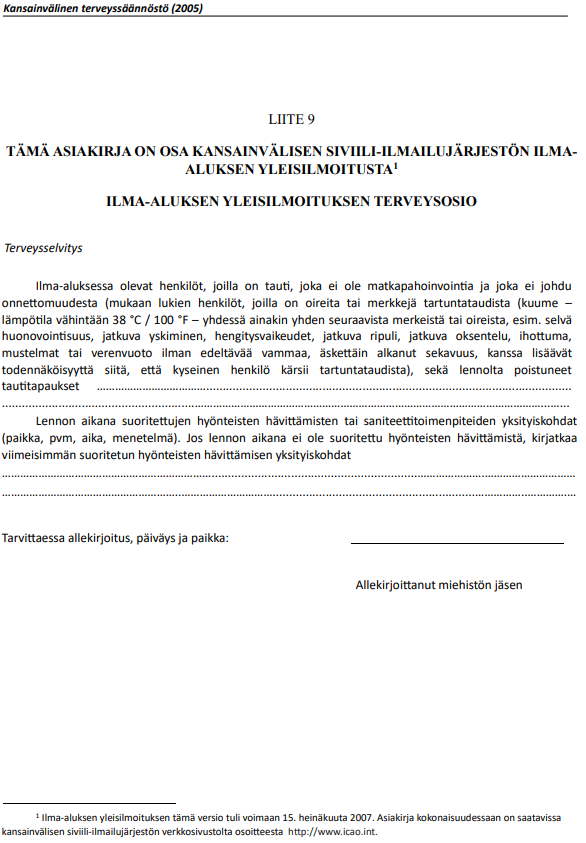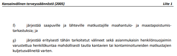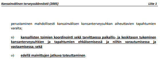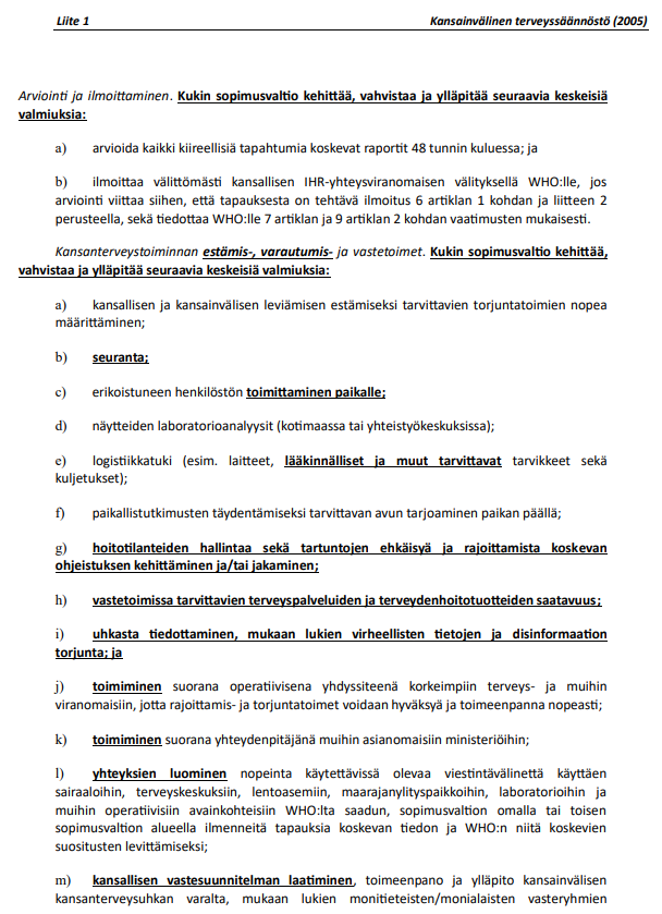 Suomi on kannattanut maailmanlaajuisen terveyshätätilannevalmiuden ja -varautumisen sekä -vasteen vahvistamista ja WHO:n ja EU:n merkittävää roolia työssä. Suomi piti neuvotteluissa tärkeänä, että IHR:n muutoksilla saatetaan sopimus ajan tasalle muuttuneeseen toimintaympäristöön ja voidaan tukea sen toimeenpanoa myös tulevaisuudessa. Suomi korosti neuvotteluissa sen merkitystä, että mahdollisen soveltamisalan laajentamisen vaikutukset arvioidaan tarkasti, ja että säännöstön toimivuutta ei tule vaarantaa.