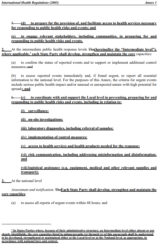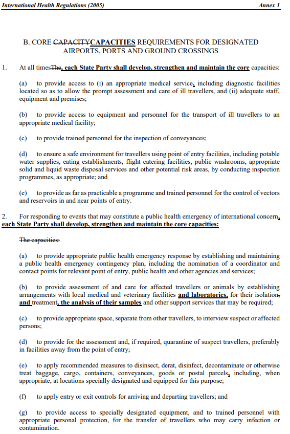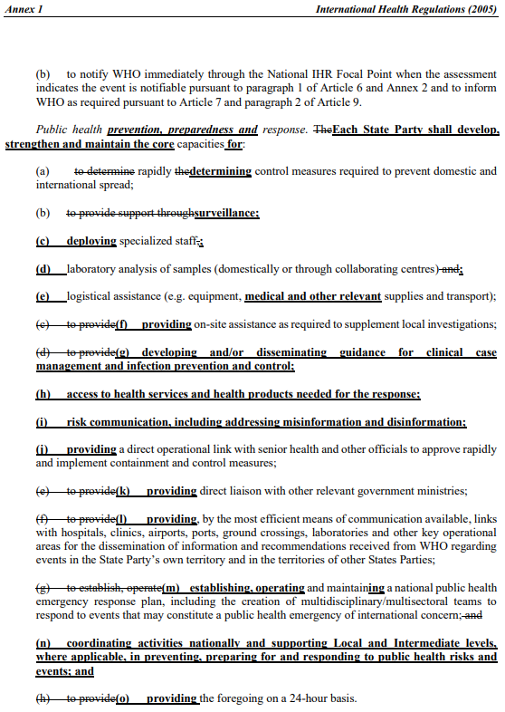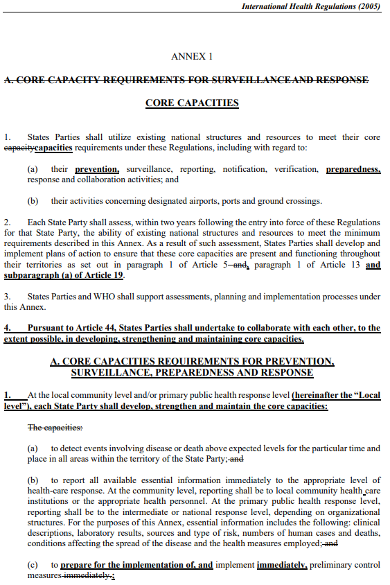 Artiklaan tehtiin teknisiä täsmennyksiä sekä lisättiin kolme kohtaa. Artiklan 1 kohdassa määrätään edelleen sopimusvaltion velvollisuudesta kehittää, vahvistaa ja ylläpitää valmiuksiaan vastata pikaisesti ja tehokkaasti kansanterveysuhkiin ja kansainvälisiin kansanterveysuhkiin. Kohtaan tehtiin teknisiä täsmennyksiä siten, että aiemmat kirjaukset valmiuksista muutettiin muotoon keskeinen valmius. Kohtaan täsmennettiin myös, että sopimusosapuolten keskeisiin valmiuksiin kuuluu kansainvälisiin kansanterveysuhkiin, ml. pandemiahätätilanteeseen, vastaamisen lisäksi tällaisten tilanteiden ehkäiseminen, ja niihin valmistautuminen, myös hauraissa ja humanitaarisissa olosuhteissa.