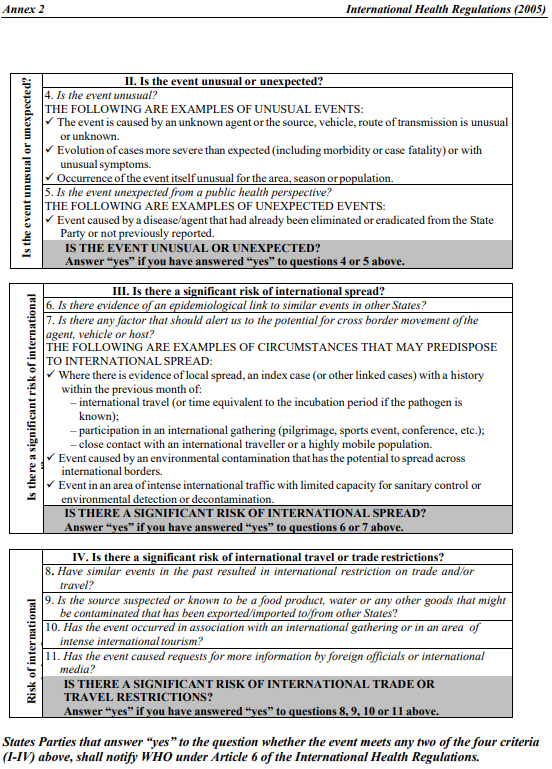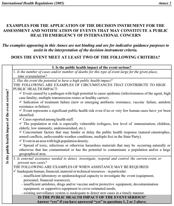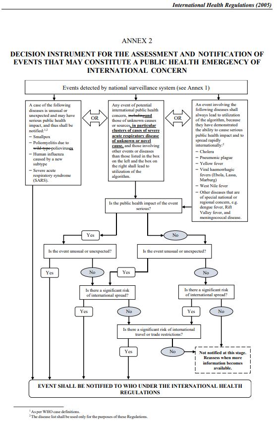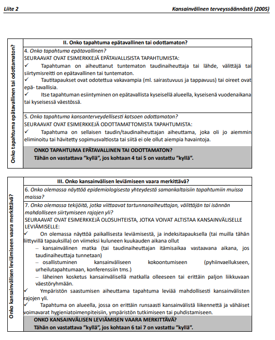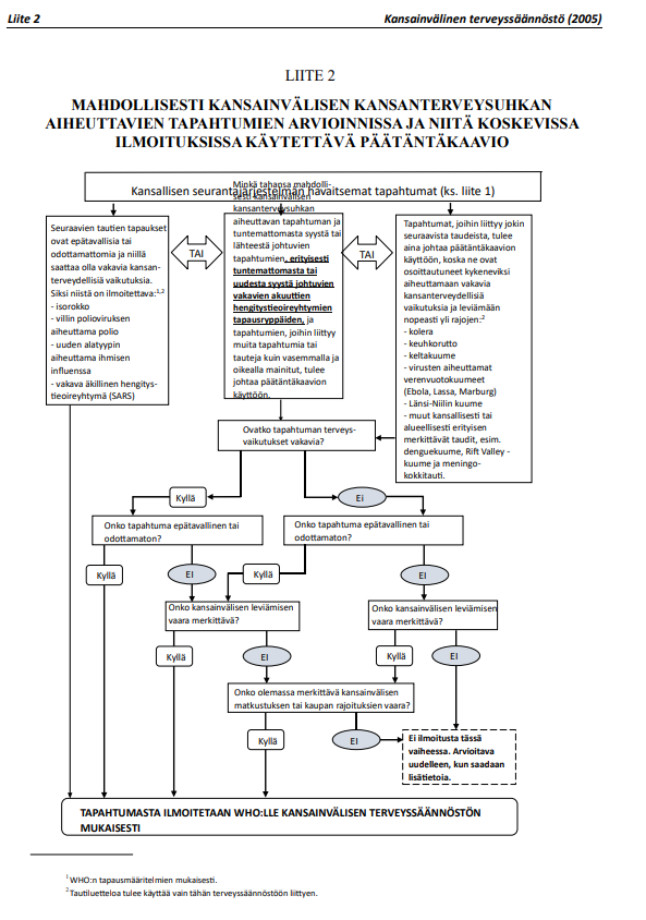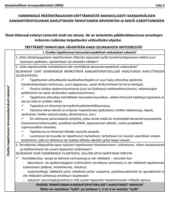 WHO:n kansainvälinen terveyssäännöstö (International Health Regulations, jäljempänä myös IHR, 2005, SopS 50 ja 51/2007) on keskeisin voimassa oleva kansainvälinen sopimus ja yhteistyön perusta, joka kattaa toimia rajat ylittäviin terveysuhkiin varautumiseksi ja vastaamiseksi. IHR:n tarkoituksena on tautien kansainvälisen leviämisen ehkäisy, torjunta ja hallinta. IHR:n perusteella sen osapuolet ovat sitoutuneet toimiin, joilla vahvistetaan maiden valmiutta ennaltaehkäistä, tunnistaa sekä torjua terveysuhkia. Osapuolten tulee myös raportoida havaituista uhkista.