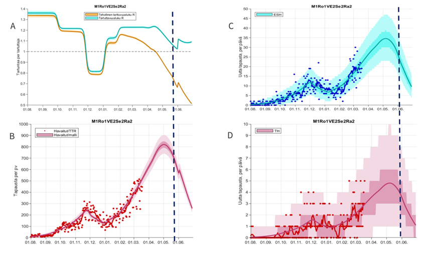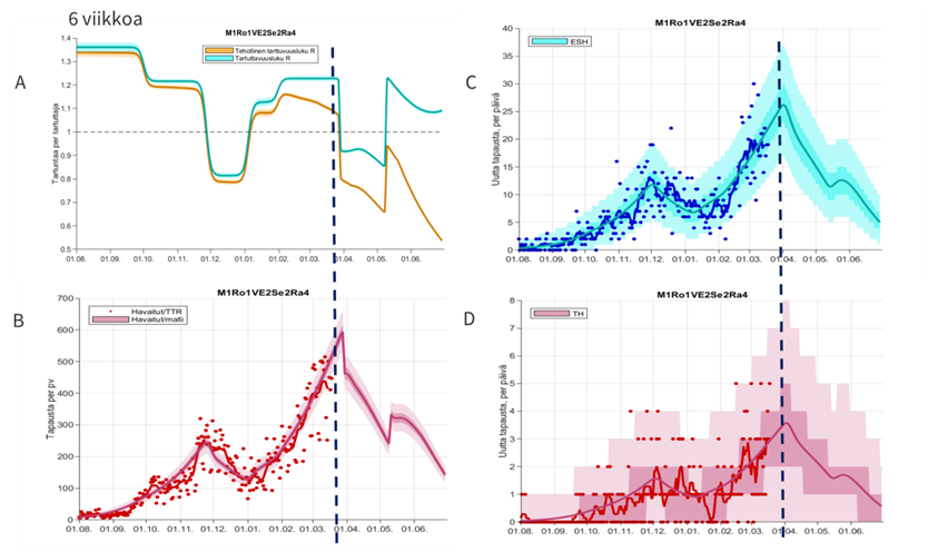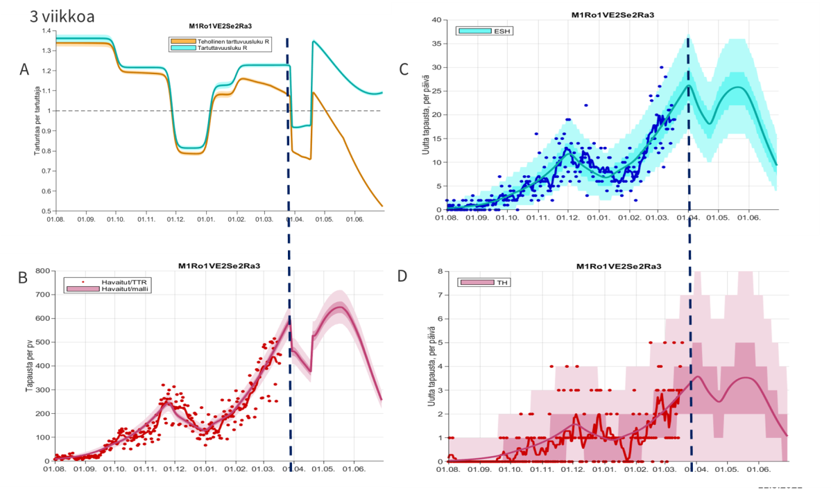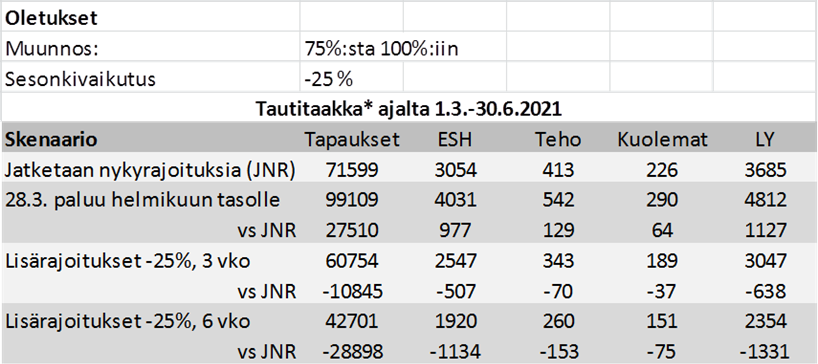 Kolmen viikon lisärajoituksella estettäisiin lähes 11000 tartuntaa verrattuna nykyrajoitusten tasoon. Kuuden viikon lisärajoituksilla estettäisiin lähes 29000 tartuntaa. Vähenemät sairaalahoitojaksoissa olisivat noin 500 (3 viikkoa) ja 1100 (6 viikkoa) ja tehohoitojaksoissa vastaavasti noin 70 ja 150. Elinvuosia säästyisi kolmen viikon sululla noin 600 ja kuuden viikon sululla noin 1300.