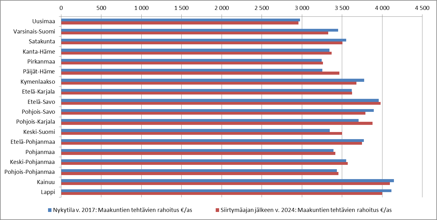 Maakuntien saama yleiskatteellinen rahoitus on pienimmillään 2 976 euroa / asukas ja suurimmillaan 4 144 euroa / asukas vuonna 2019. Siirtymäkauden jälkeen rahoitus muuttuisi niin, että yleiskatteellinen rahoitus olisi pienimmillään 2 956 euroa / asukas ja suurimmillaan 4 096 euroa / asukas vuonna 2024. Rahoituksen lähtötasosta siirryttäisiin porrastetusti viiden vuoden siirtymäkauden aikana lopulliseen rahoitustasoon. Siirtymäkausi tasoittaa merkittävästi maakuntien muutosta ja mahdollistaa maakuntien toiminnan sopeuttamisen laskennallisen mallin rahoitustasoon. Siirtymäkauden aikana yksittäisen maakunnan rahoituksen vuosimuutos olisi nykyisten laskelmien perusteella enintään noin +45 euroa / asukas ja -25 euroa / asukas.