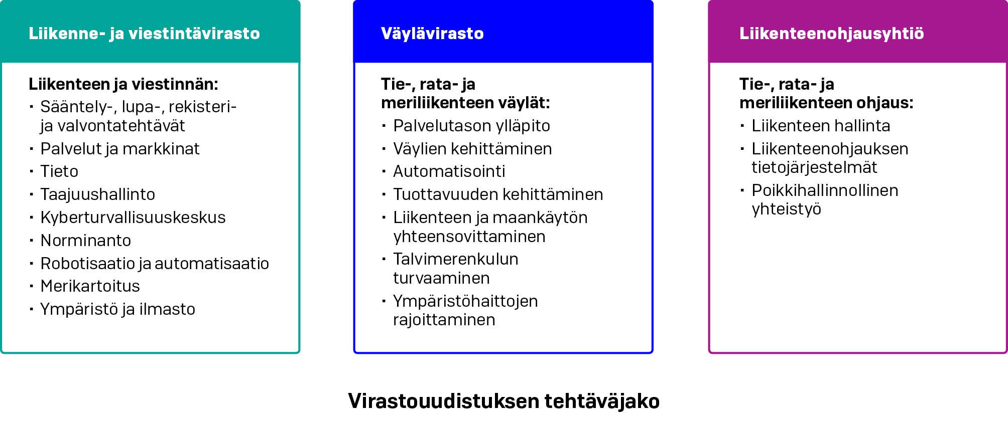 Tehtävänjakoa ITS-direktiivin (Euroopan parlamentin ja neuvoston direktiivi 2010/40/EU tieliikenteen älykkäiden liikennejärjestelmien käyttöönoton sekä tieliikenteen ja muiden liikennemuotojen rajapintojen puitteista) liittyvissä tehtävissä liikenne- ja viestintäministeriön hallinnon alalla selkeytettäisiin siten, että Liikenne- ja viestintävirastolla olisi tehtävänään valtakunnallinen ja strategisen tason älyliikenteen kehittämistyö ja siihen liittyvä kansainvälinen vaikuttaminen ja edunvalvonta. Väyläviraston tehtävänä olisi väyläverkon fyysisen ja digitaalisen infrastruktuurin kehittäminen ja liikenteen automaatiokehityksen edistäminen väyläverkonhaltijana.